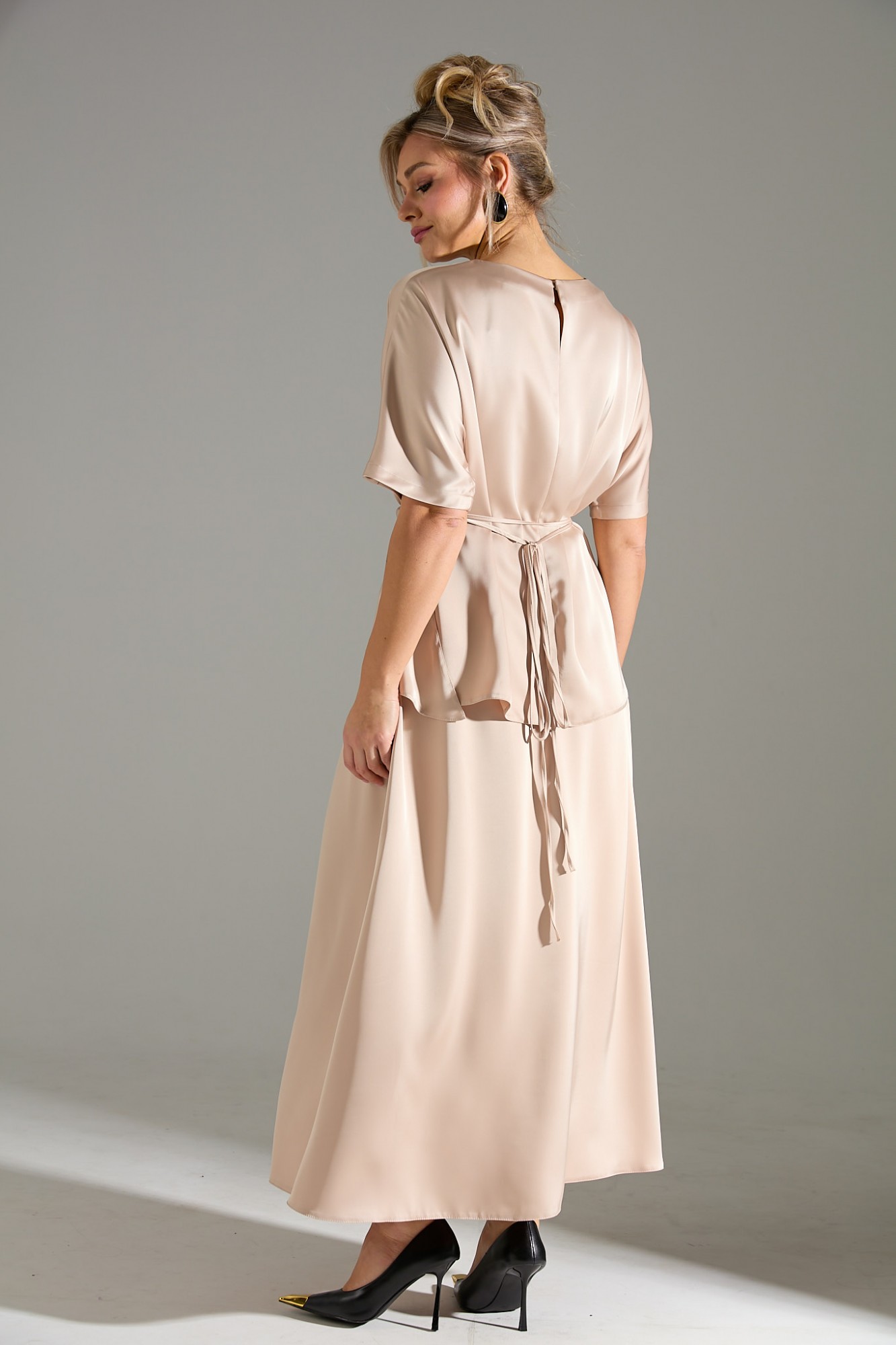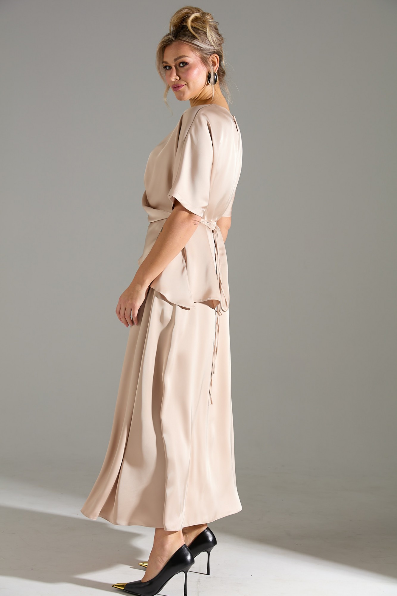 Костюм 2ка из лёгкой струящейся ткани с атласным благородным блеском, состоящий из блузки и юбки. Блузка свободного объёма, по переду имитация застежки на запах. В комплекте шнур из основной ткани, которым можно приталить блузу, обвязав по кругу, или продеть через боковые швы и завязать по спинке. Юбка широкого объёма.