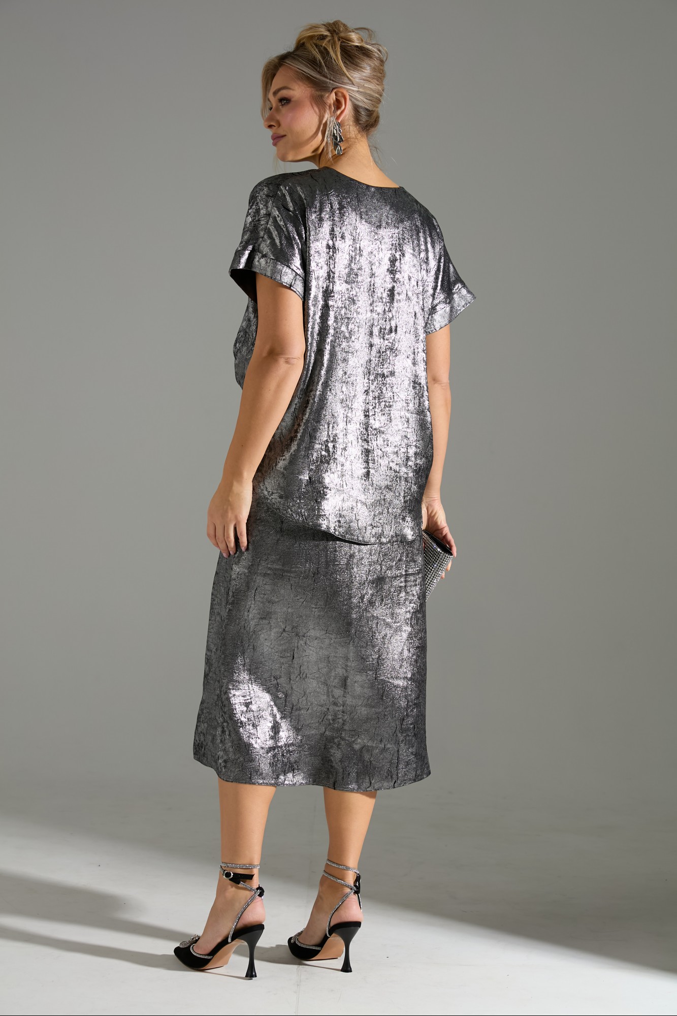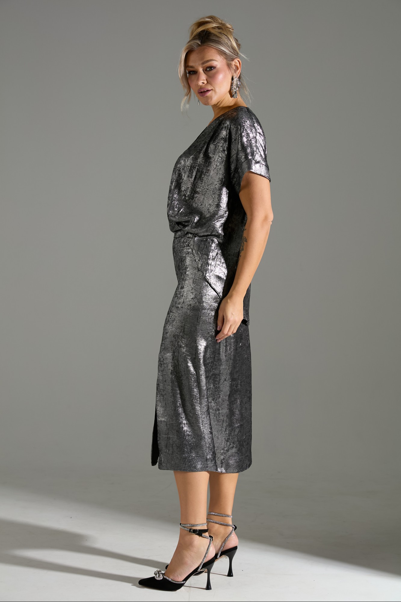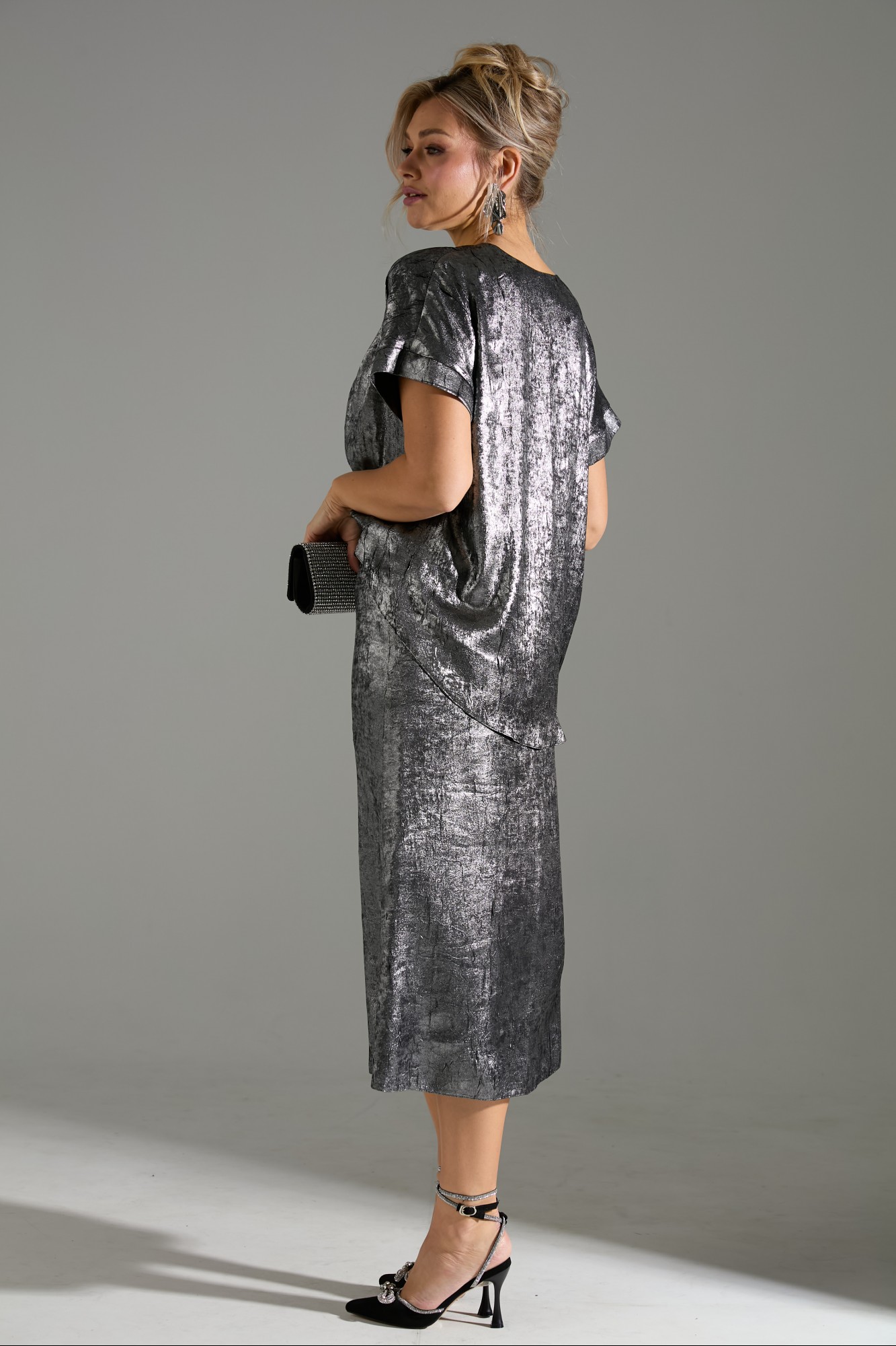 Комплект 2ка, состоящий из блузки и юбки. Блузка свободного силуэта с короткими рукавами. Горловина V-образная. Низ блузки разноуровневый: спереди короче, сзади длиннее. Блузка по талии может соединяться с юбкой с помощью молнии , создавая имитацию платья. Юбка слегка расширена к низу, длиной ниже колена. По переду юбки разрез на левую сторону. Пояс юбки по переду на эластичной тесьме, застёжка на потайную молнию.
