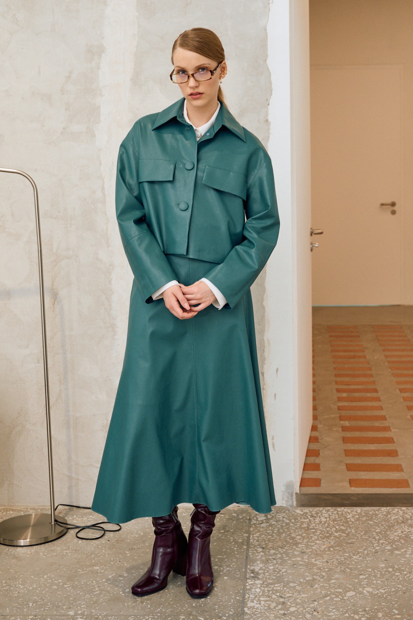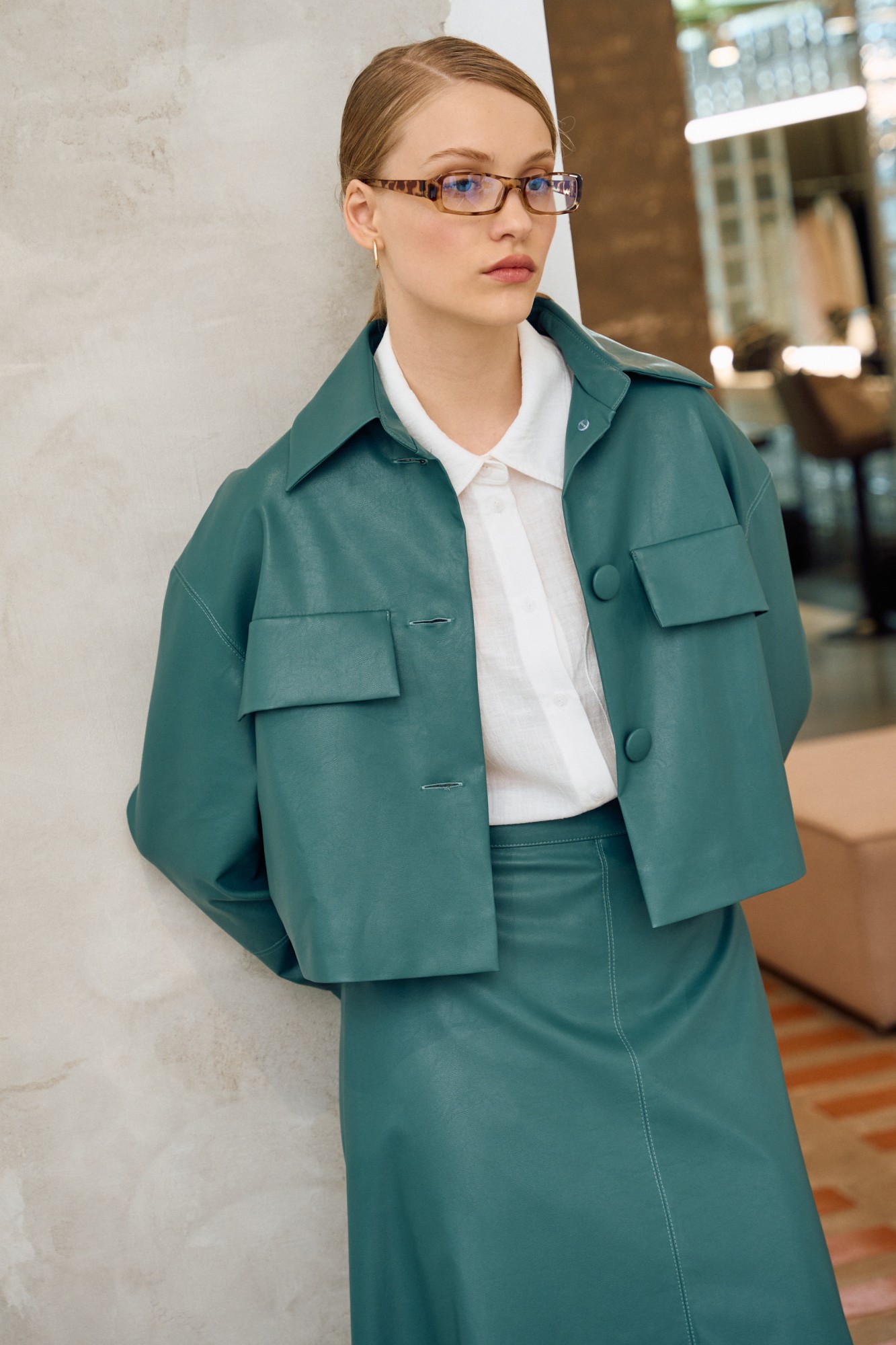 Комплект состоит из жакета и юбки, и выполнен из экокожи. Жакет укороченный, прямого кроя, на подкладке. Линия плеча спущена, рукав длинный, ниже уровня локтя подрез. Воротник рубашечного кроя, застежка на петли и пуговицы. Выше уровня груди отлетные клапаны. По спинке кокетка. Юбка А-силуэта на притачном поясе, на подкладке. По передней части юбки средний шов, по задней части юбки средний шов, переходящий в застёжку на потайную молнию.
