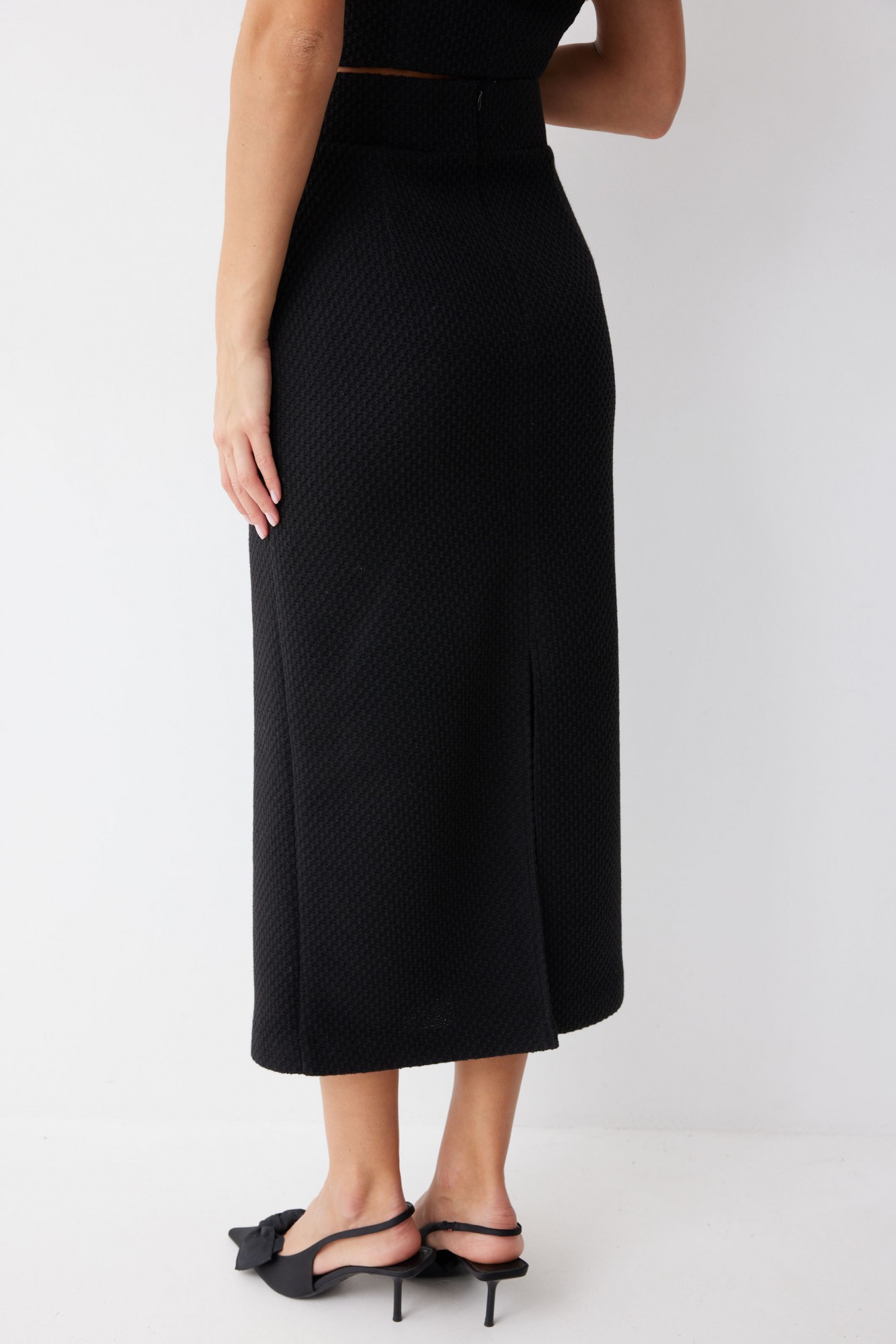 Жакет полуприлегающего силуэта из трикотажного полотна. Горловина округлая по центру застежка на петли и пуговицы. Рукав втачной короткий. По переду таллиевые вытачки и накладные карманы, на спинке – таллиевые вытачки. Жакет на подкладке. Обращаем ваше внимание, что фурнитура может отличаться от фото. Юбка прямого силуэта из трикотажного полотна. По верху юбки притачной пояс. На спинке юбки в центральном шве застежка на потайную молнию, по низу разрез. Юбка на подкладке.