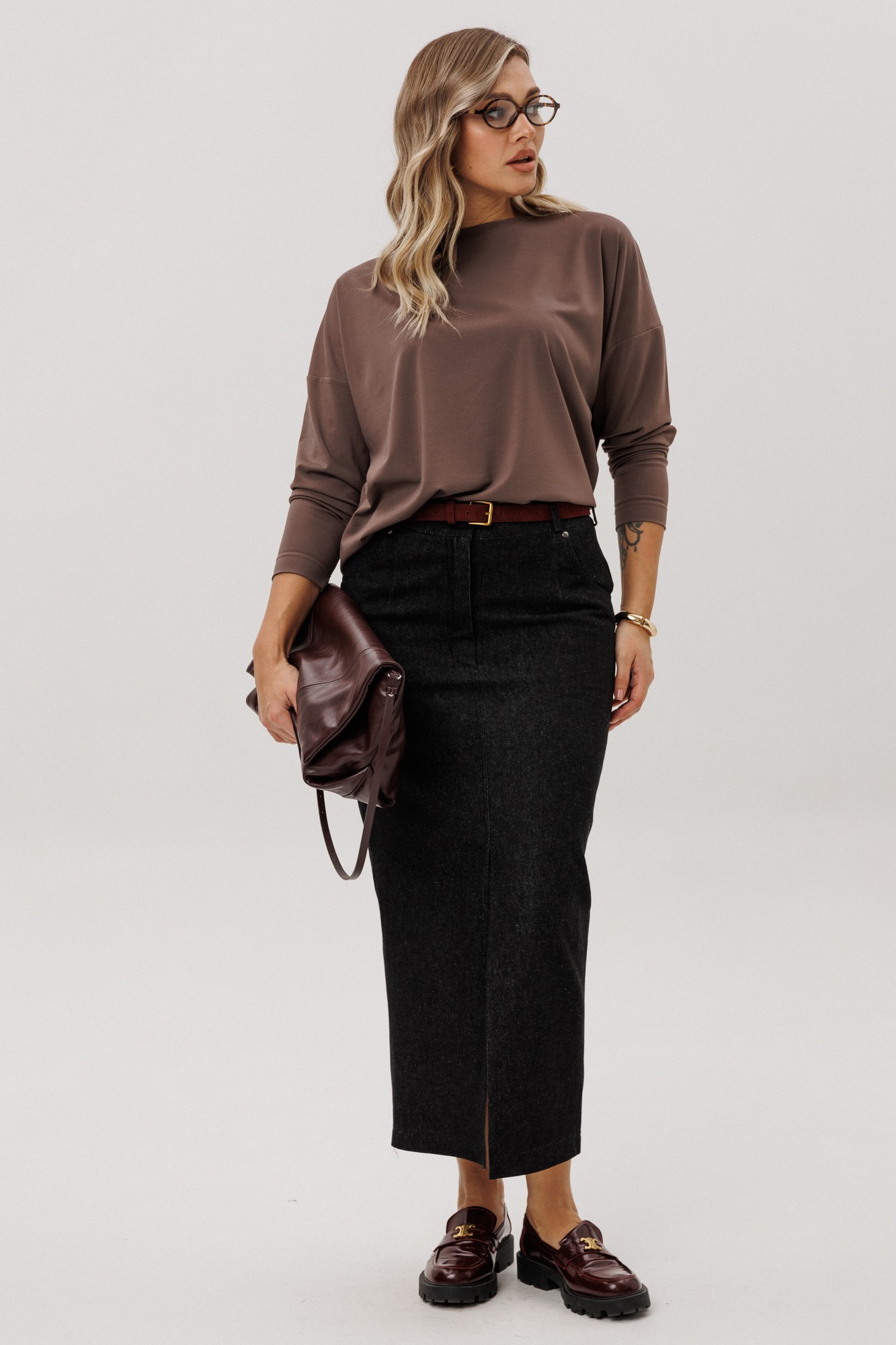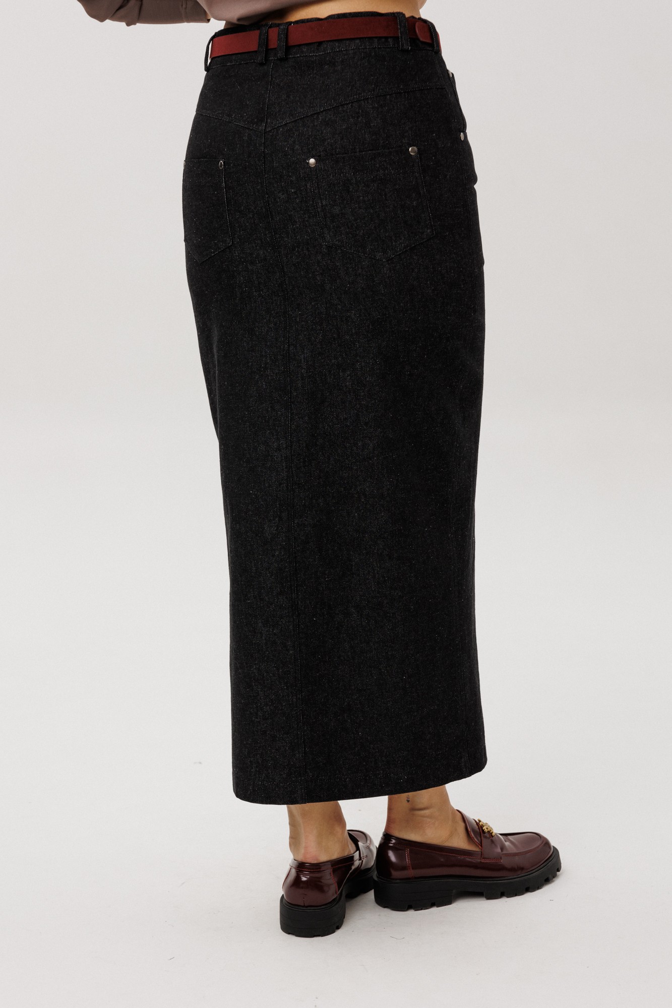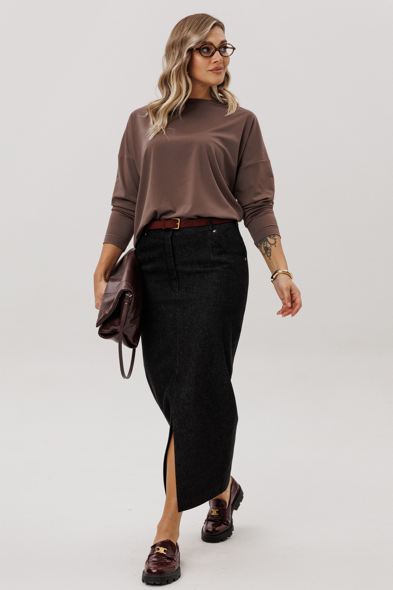 Комплект двухпредметный, состоит из джемпера и юбки. Джемпер свободного кроя с длинным рукавом. По низу широкая подгибка. Юбка прямого силуэта в джинсовом стиле. Застежка по переду на тесьму-молния. В среднем шве по переду разрез.