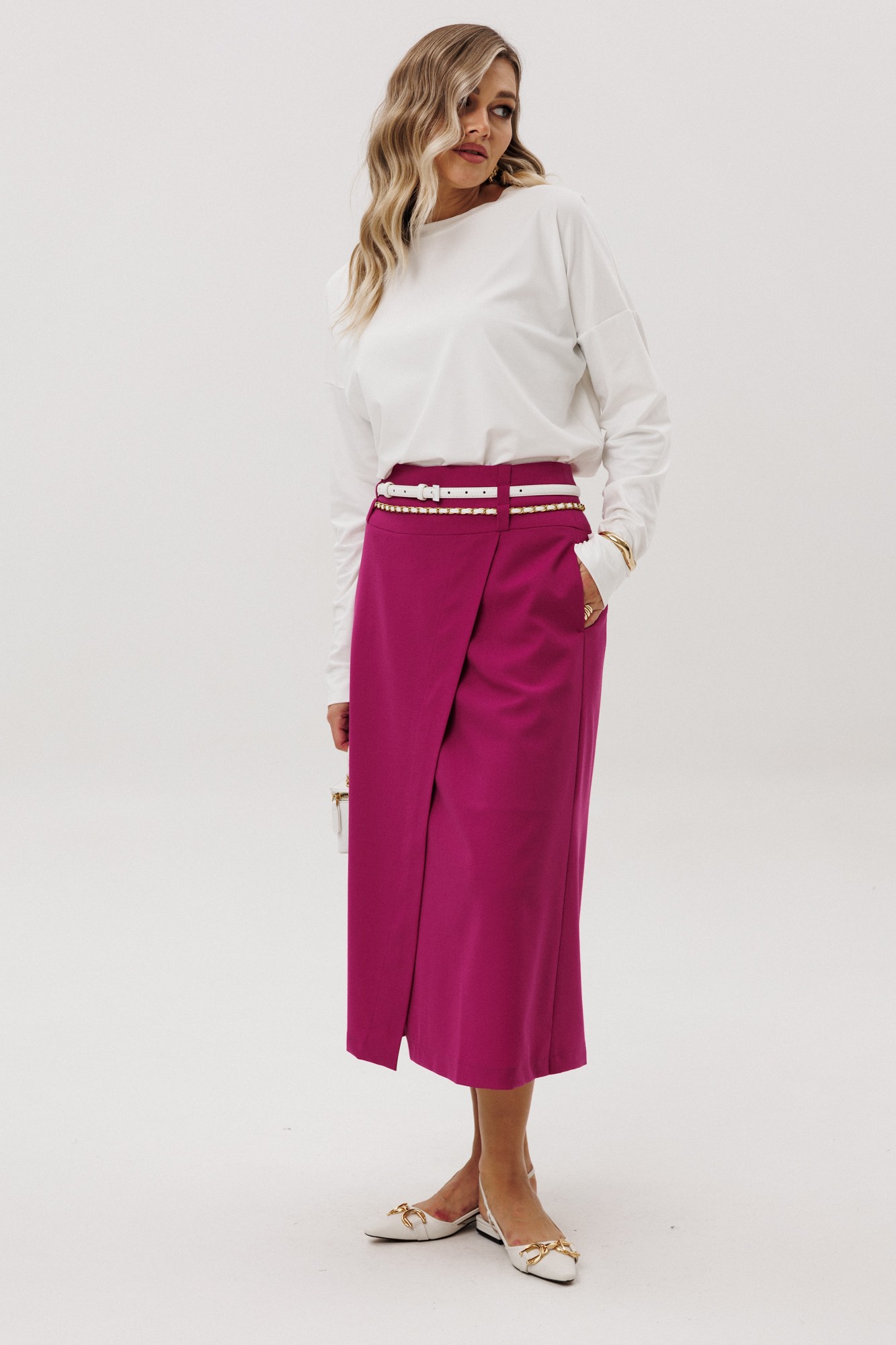 Комплект двухпредметный, состоит из джемпера и юбки. Джемпер свободного кроя с длинным рукавом. По низу широкая подгибка. Юбка из тонкой костюмной ткани на подкладке А-образного силуэта. Юбка по линии талии на широкой кокетке. По кокетке настрочены шлевки для декоративного ремешка. По передней половинке запах. В боковых швах карманы. Застежка по центру задней половинке на потайную тесьму-молнию.