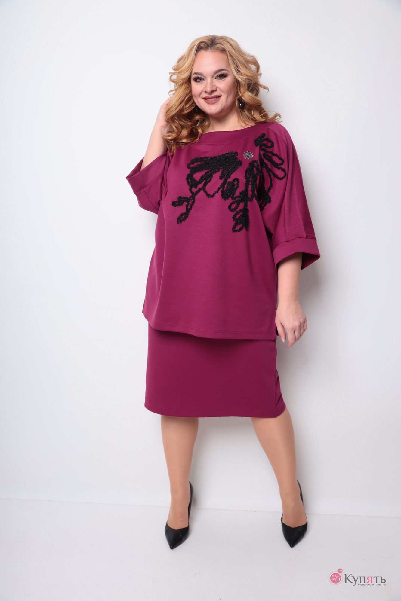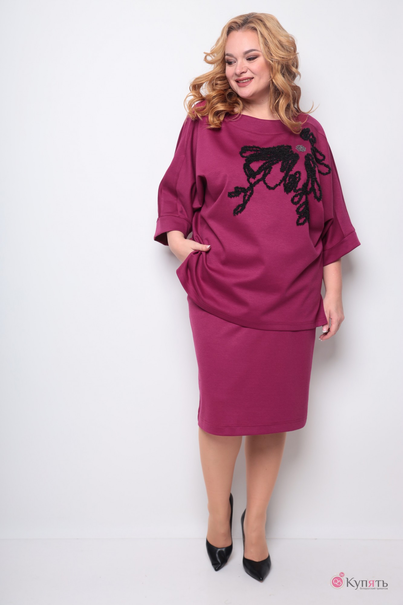 Женственный комплект из трикотажного полотна дарит образу мягкость и элегантность, благодаря чему комплект подойдет и для праздничных образов, а также и для будней. Комплект отличается свой практичностью и удобством, благодаря чему будет одним из самых любимых в вашем гардеробе. Юбка садится по фигуре, ниже колена, есть карманы, пояс на резинке. Джемпер свободного прилегания, по бокам два не глубоких разреза. Рукав цельнокроеный 7/8. По переду джемпера декоративная вышивка. Длина юбки 67 (±1 см), длина джемпера по спинке 71 см (±1 см)., длина рукава от горловины 51 см. Изделие подойдет на рост 170 см.