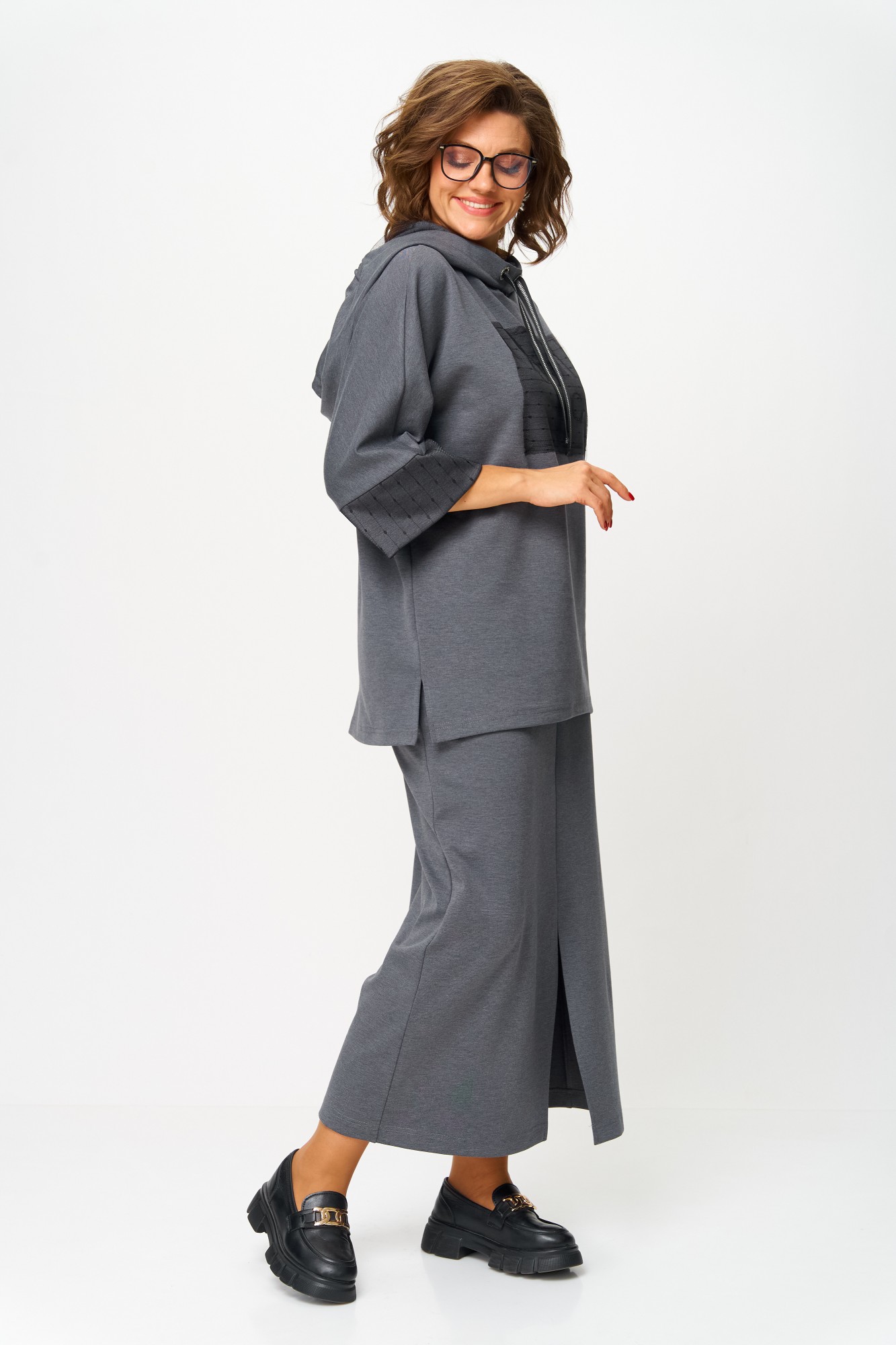 Длина худи по спинке 73 см +/- 1 см, длина рукава от горловины 42 см +/- 1 см; длина юбки по боковому шву 94 см +/- 1 см. Изделие подойдет на рост 170 см.