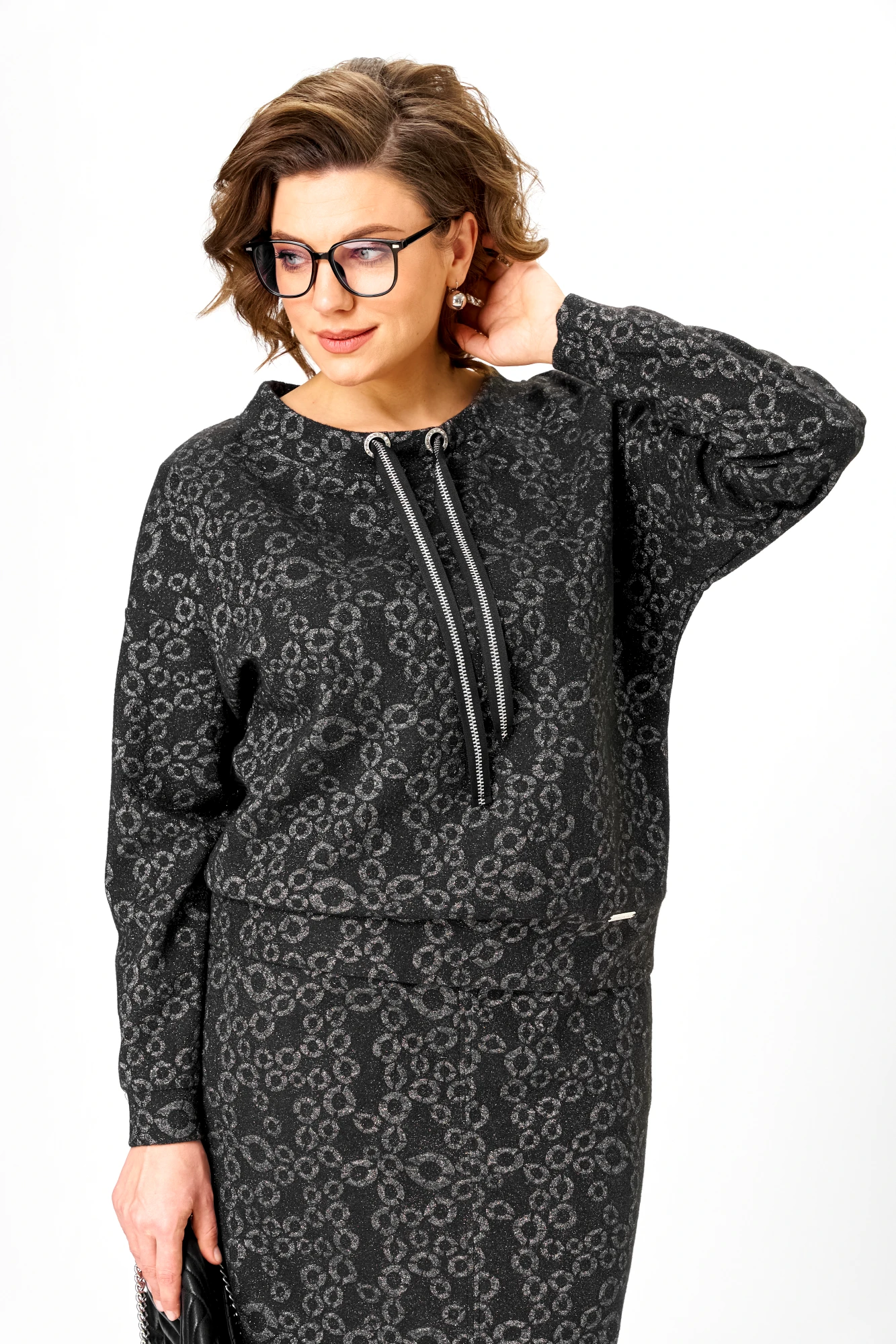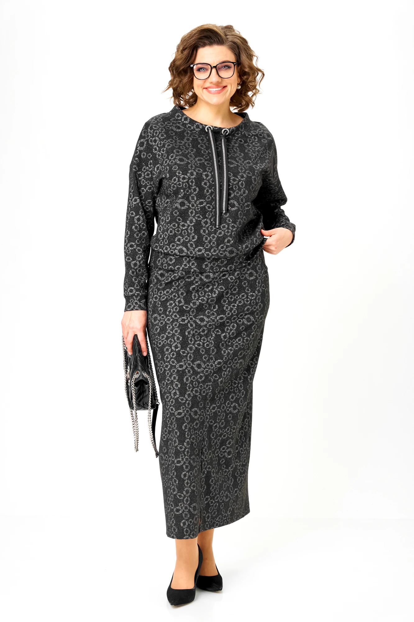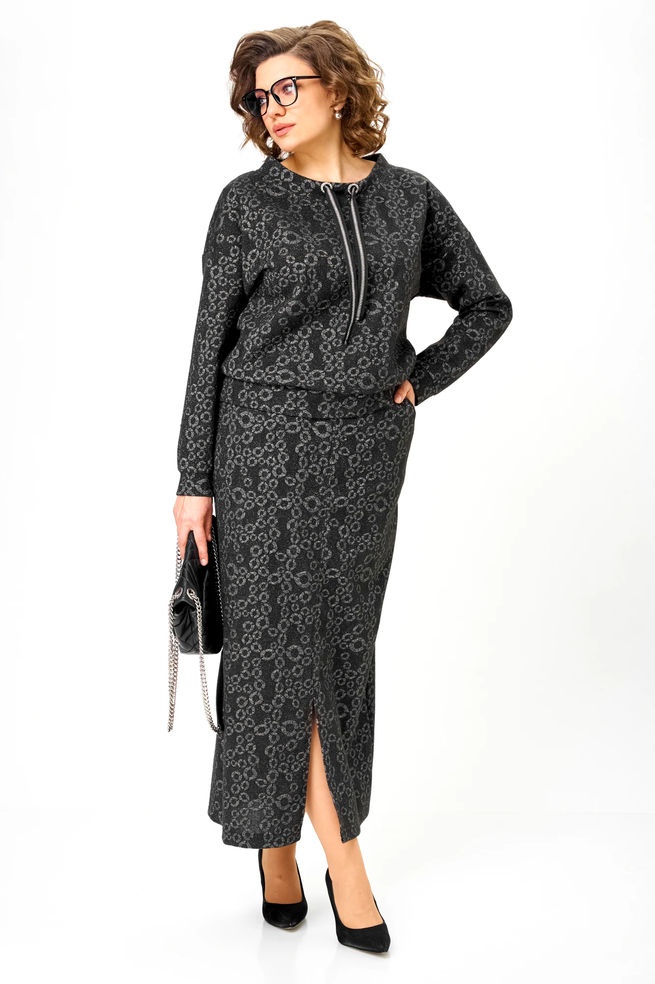 Этот комплект выбирают женщины, которым важно выглядеть статусно без усилий и перегруженной стилизации. Трикотаж с тёмным люрексом создаёт глубину образа и визуально вытягивает силуэт: мерцание проявляется в движении, оставаясь сдержанным и благородным.