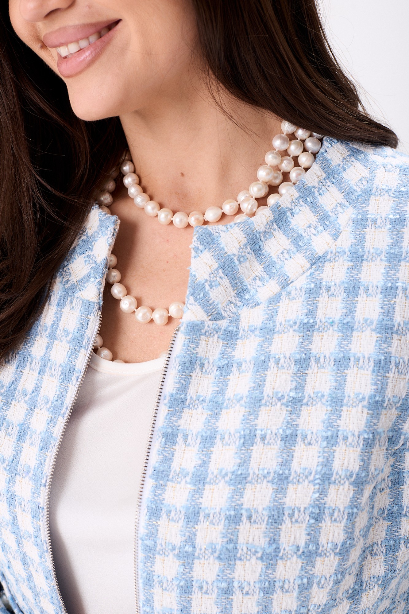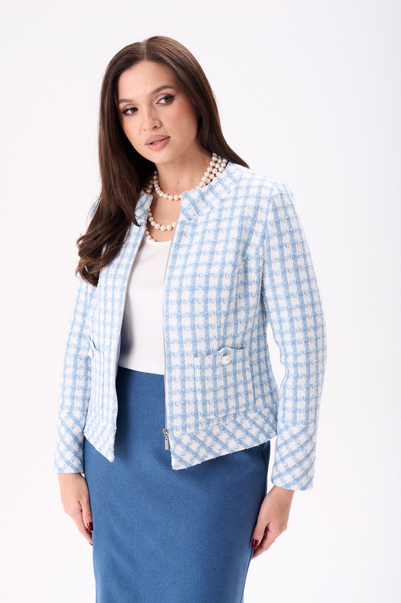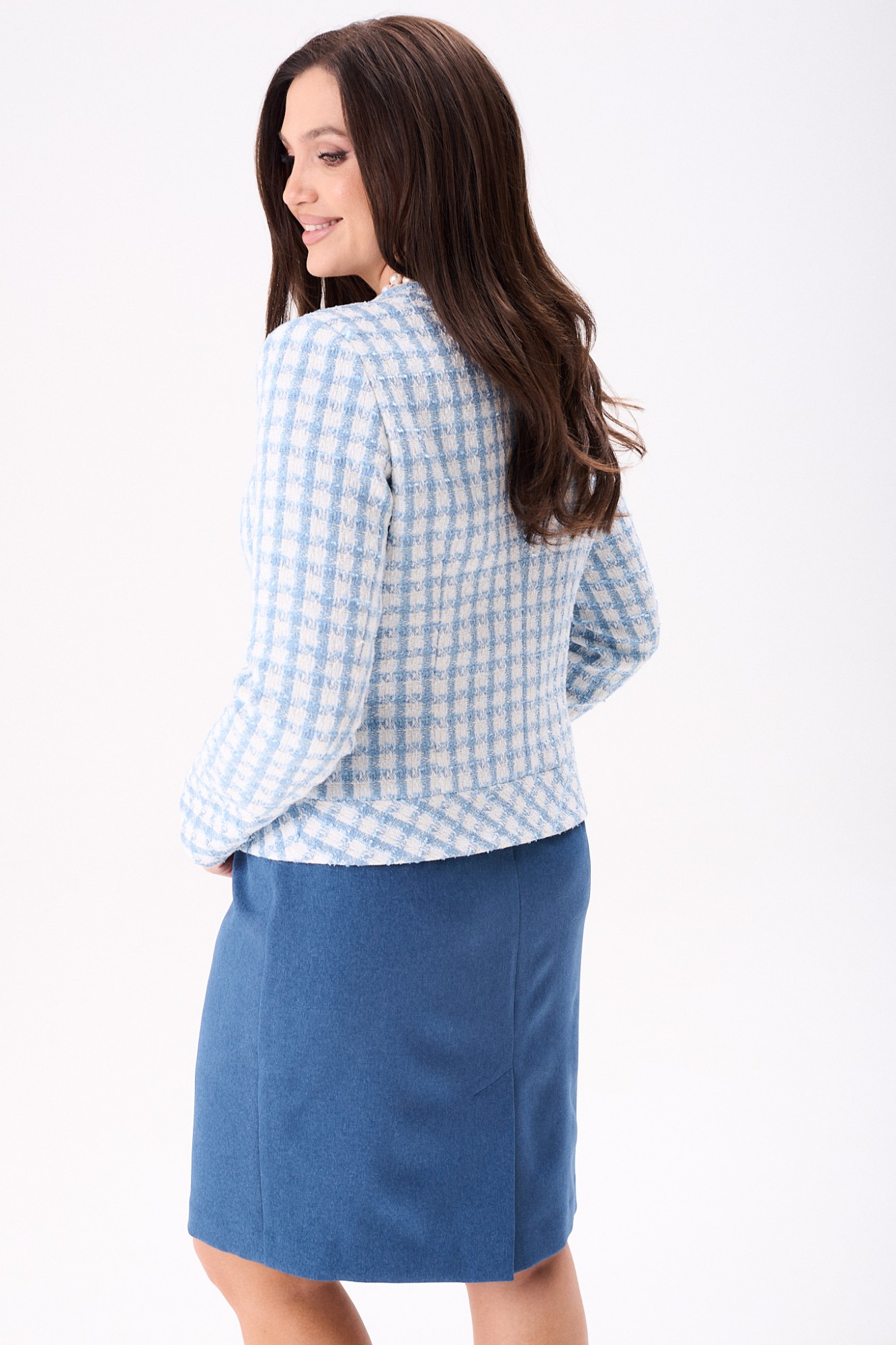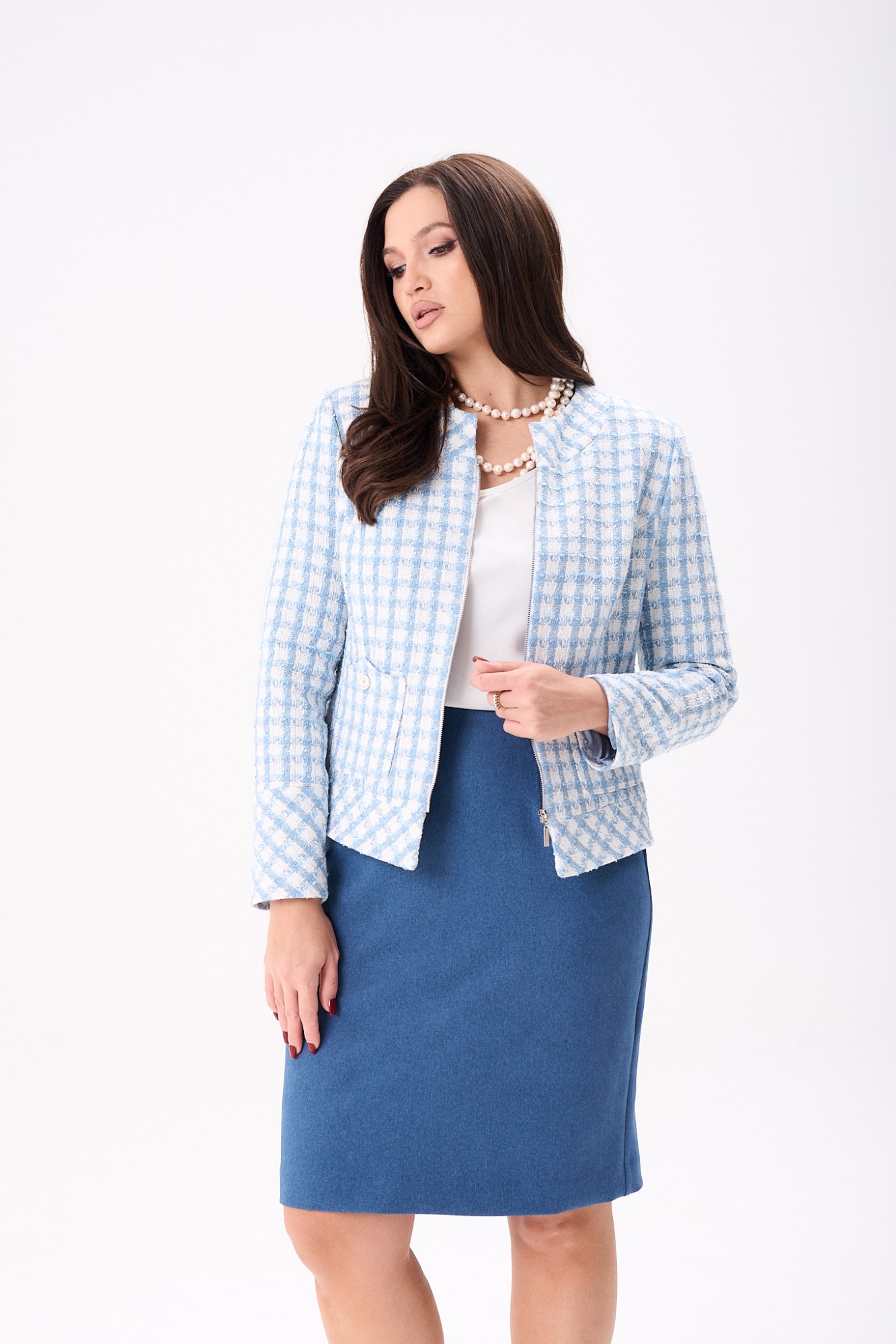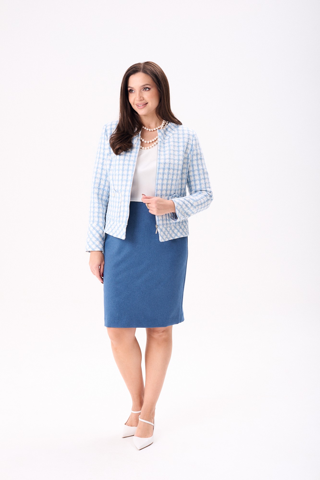 Костюм женский полуприлегающего силуэта состоит из жакета и юбки. Жакет на подкладке. По переду нагрудные вытачки, накладные фигурные карманы, застёжка на тесьму молния. Спинка с талевыми вытачками и центральным швом. По горловине и низу жакета притачная планка. Горловина круглая. Рукава двухшовные втачные на широкой манжете. Юбка, слегка зауженная к низу, без пояса, на обтачке. По переду талевые вытачки. По спинке талевые вытачки. Застёжка потайная тесьма молния расположена в центральном шве спинки. Юбка на подкладке.