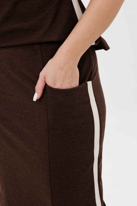 Костюм женский, состоящий из джемпера и юбки. Джемпер свободного силуэта. Перед с нагрудными вытачками. Вдоль боковых швов настрочена отделочная тесьма. Рукав до локтя одношовный, втачной. По переду частичная застежка на тесьму-молнию. Воротник стоячий отложной. Юбка прямого силуэта, с рельефами по переду, заканчивающимися шлицами. По бокам переда обработаны карманы. Спинка со ср. швом и застежкой на тесьму-молнию. По бокам Юбки настрочена отделочная тесьма. Юбка на подкладке. Верх обработан притачным поясом.