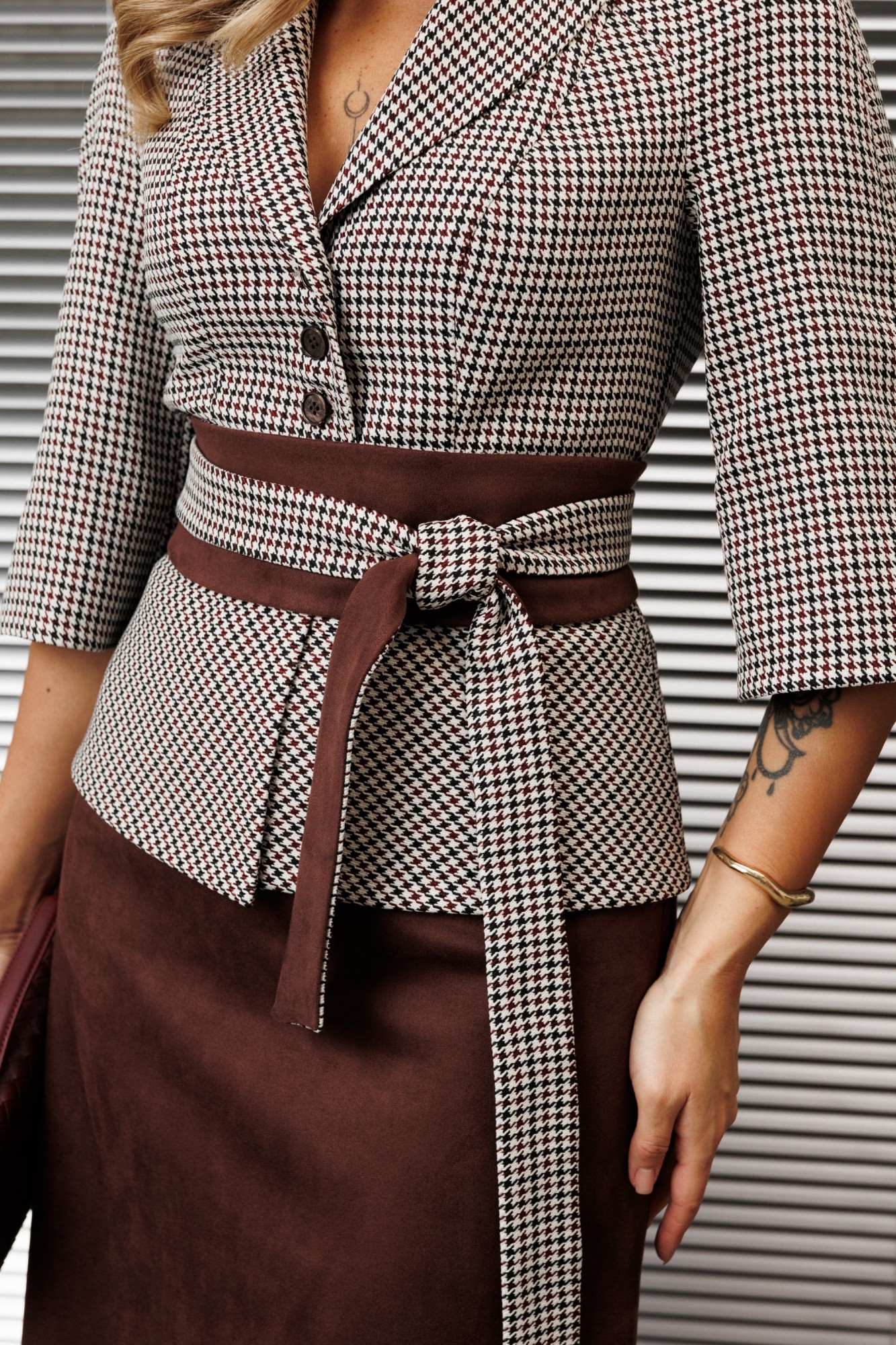 Бестселлер нашей коллекции - двухпредметный костюм, состоящий из жакета и юбки. Акцентом данного комплекта является съемный пояс. Для создания данного образа мы использовали мелкую клетку в тандеме с экокожей. Жакет прилегающего силуэта с отрезной баской по переду и спинка с рельефами. Рукав-реглан. Юбка А-силуэта на притачном поясе, сзади с резинкой. Застежка на тесьму-молнию в боковом шве. Костюм на подкладке.
