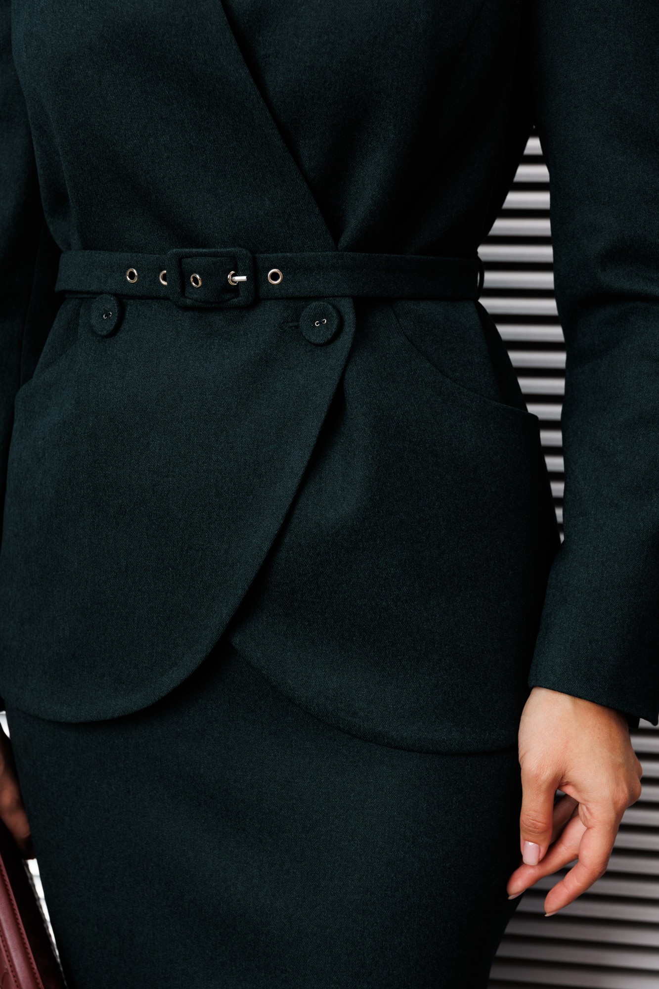Жакет полуприлегающего силуэта с двухбортной застёжкой на одну пару обтяжных, из основной ткани, пуговиц и одной потайной. Край борта фигурной формы, придающей динамичность жакету. На полочке выполнены фигурные рельефы, которые дополнены функциональными карманами, гармонично вписывающимися в общую структуру изделия. Спинка со средним швом и вертикальными рельефами из проймы. Воротник с цельнокроеной стойкой, что придает жакету элегантный и строгий вид. Рукава двухшовные, со шпицей в локтевом шве на одну пуговицу, также обтяжную из основной ткани. Жакет дополнен шлёвками и съемным поясом из основной ткани с пятью блочками на обтяжную пряжку, чем придает дополнительный акцент на талии. Жакет на подкладке. Юбка, длиной ниже колена, зауженная к низу. Застёжка в левом боковом шве на потайную молнию и пуговицу. На переднем и заднем полотнище юбки обработаны талевые вытачки, которые обеспечивают точную посадку по фигуре. Юбка на поясе, сзади частично на резинке для удобства и комфортной посадки. В среднем шве юбки обработана шлица, которая обеспечивает свободу движений. Юбка, также на подкладке. Костюм выполнен из качественной костюмной ткани, что придает изделию прочность и долговечность, а также создает элегантный и современный образ, подходящий для различных деловых мероприятий и повседневной носки.