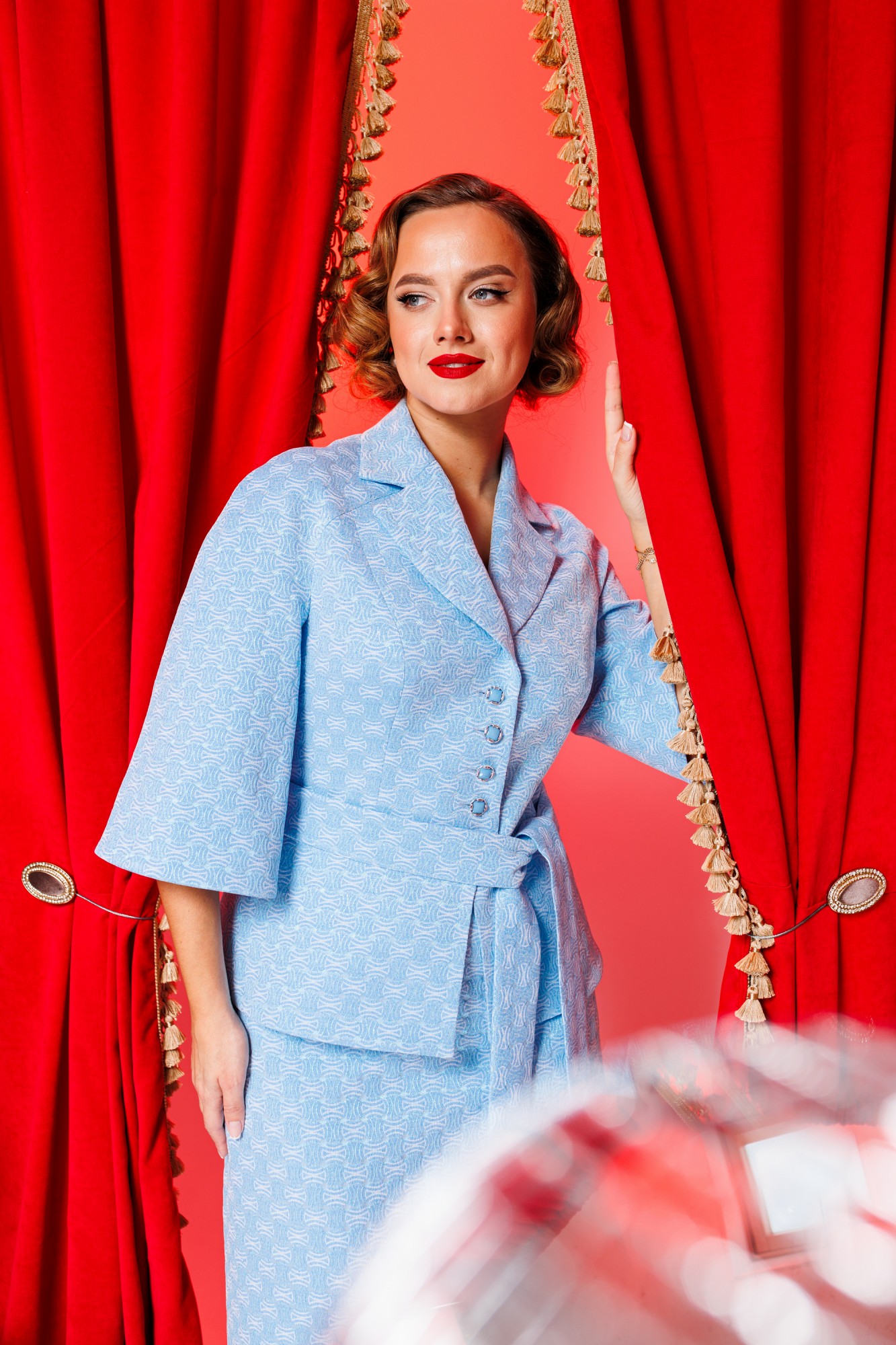 Бестселлер нашей коллекции - двухпредметный костюм, состоящий из жакета и юбки. Акцентом данного комплекта является съемный пояс. Для создания данного образа мы использовали однотонный материал с рисунком. Жакет прилегающего силуэта, с отрезной баской по переду и спинка с рельефами. Рукав-реглан. Юбка А-силуэта на притачном поясе, сзади с резинкой. Застежка на тесьму-молнию в боковом шве. Костюм на подкладке.