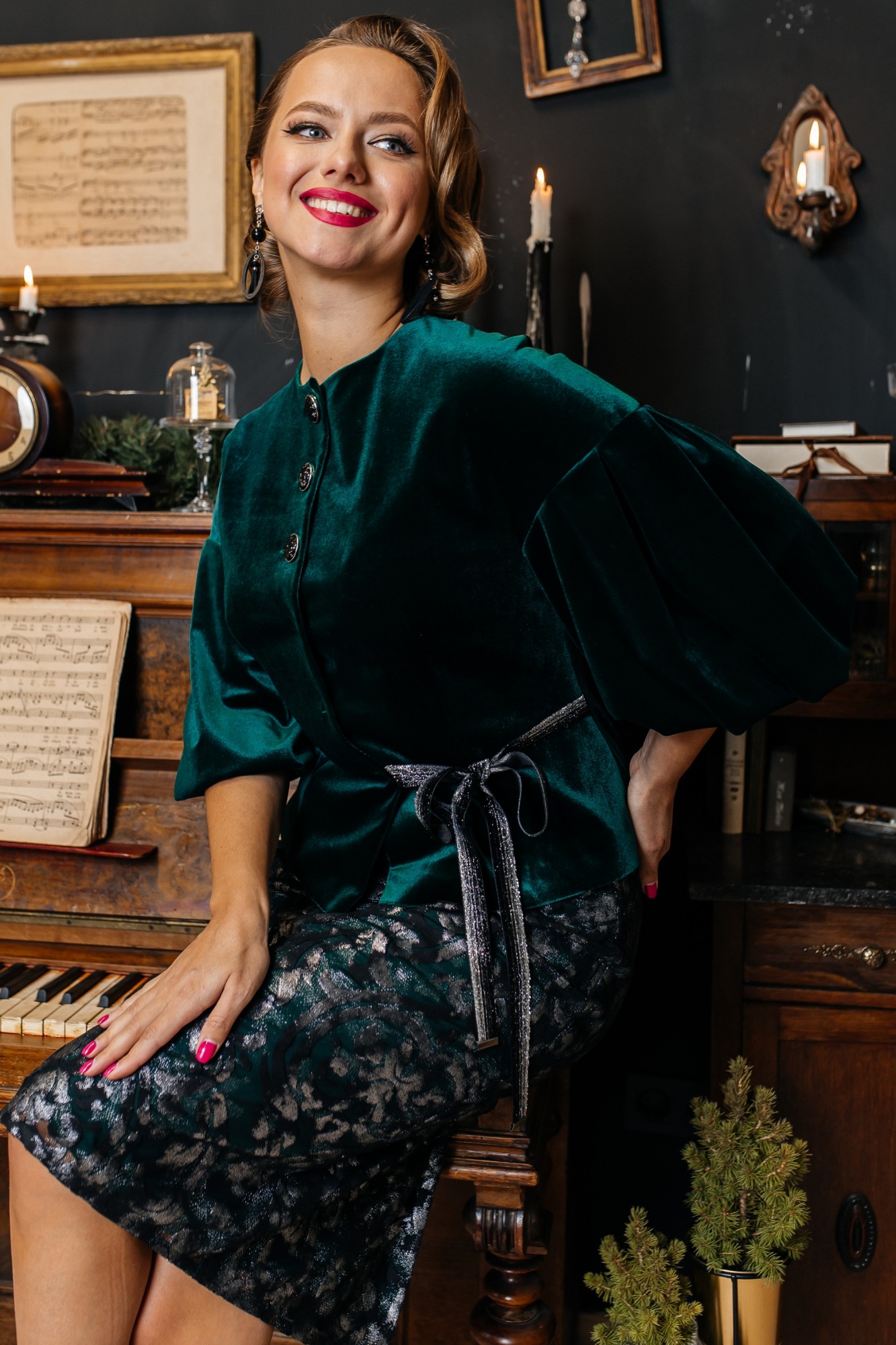 жакет: полиэстер 95% спадекс 5% (ВЕЛЮР) юбка: полиэстер 92% эластан 5% люрекс 3% (двойной слой - трикотажное полотно+гипюр)