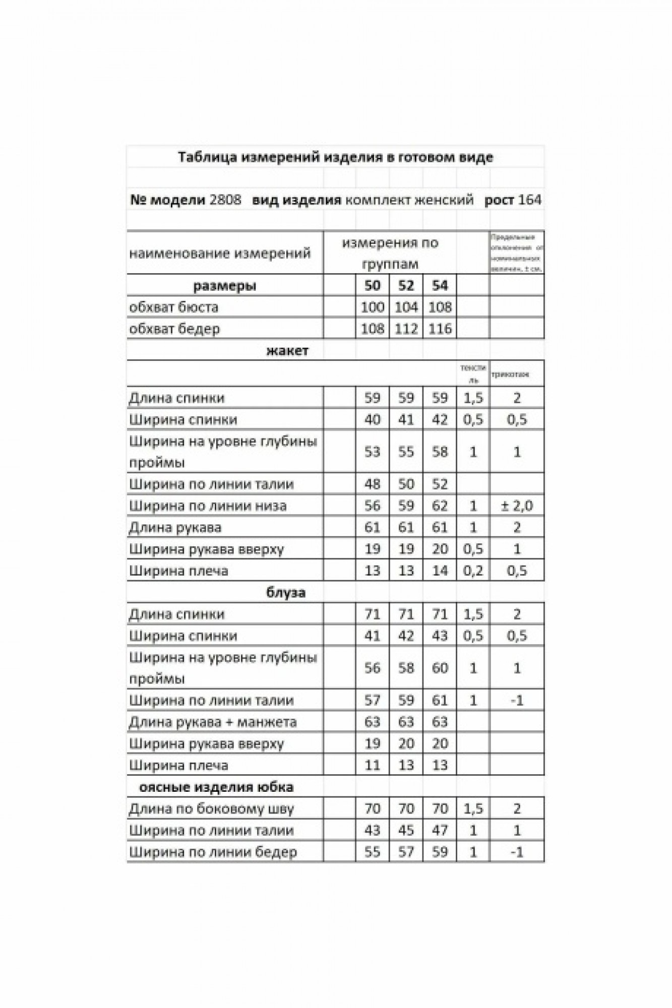 Таблица измерений