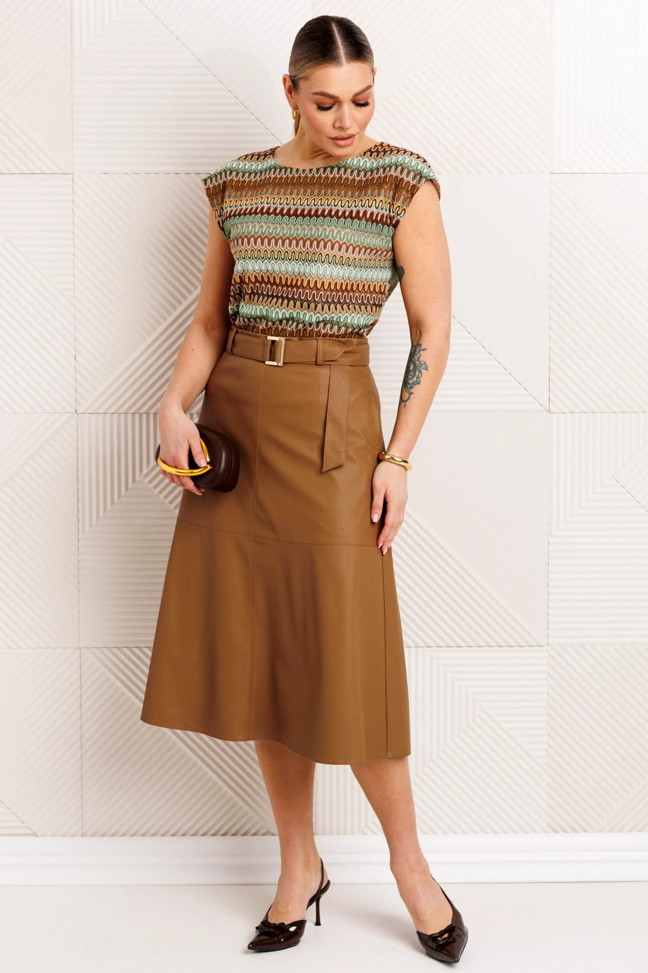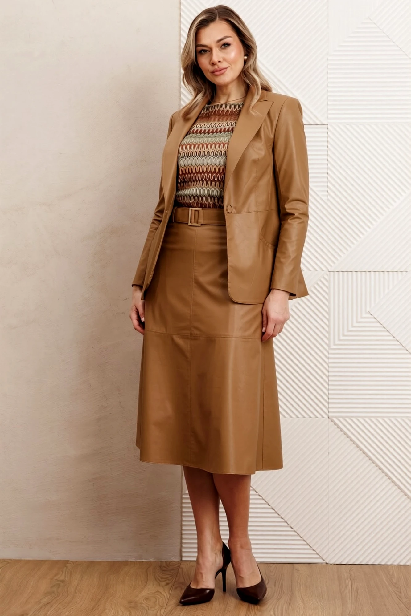 Модный и стильный костюм-тройка с топом - это идеальный выбор как для работы, так и для повседневной жизни. Жакет однобортный, полуприлегающий. Застежка жакета на одну пуговицу, чуть выше линии талии. Рукав втачной, двухшовный. Воротник отложной с лацканами. На полочке прорезные карманы с листочкой. Длина жакета ниже линии бедер. Топ выполнен из кружевного полотна. Такой топ станет отличной базовой вещью гардероба. Его можно носить на выпуск или заправлять. Топ выполнен на трикотажной подкладке. Спинка чуть длиннее полочки, вырез горловины округлый, плечо спущенное. Юбка расширенного силуэта, четырехклинка. Благодаря универсальности и практичности фасона юбка-четырехклинка уже давно является классической моделью. Она идет большинству женщин различных возрастов и типов фигур. Такой фасон способен подчеркнуть достоинства и скрыть недостатки внешности ее хозяйки. Самый хитовый вариант – это кожаная или джинсовая юбка с карманами и притачным поясом. Наша юбка выполнена из экокожи. Жакет выполнен на подкладке, юбка без подкладки.