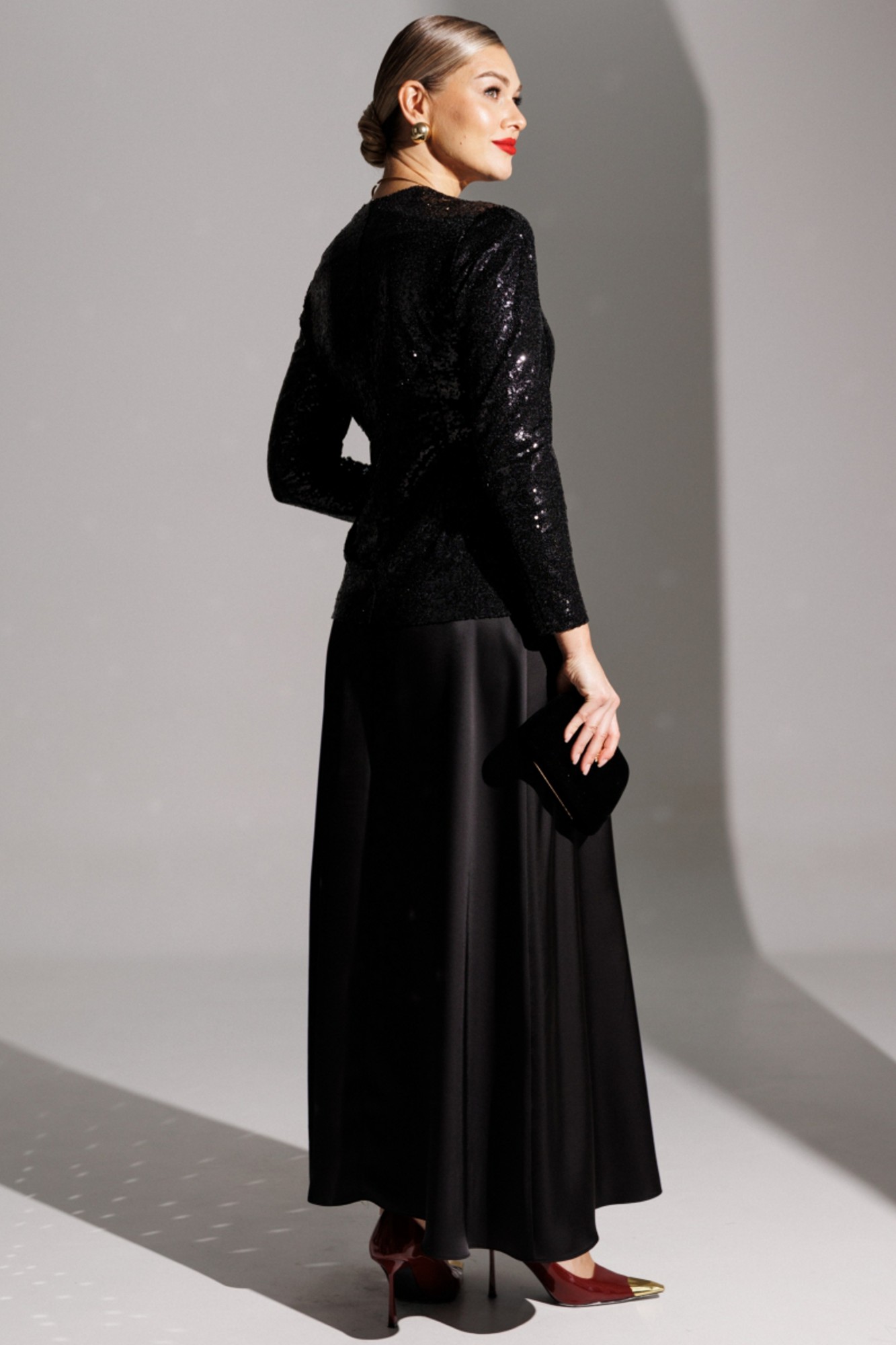 Продолжением нашей нарядной коллекции является роскошный комплект, состоящий из блузы, имитирующей жакет, и невероятной струящейся юбки из атласа длины макси. Блуза из ткани в пайетки с декоративным узлом в области талии. V-образный вырез. Блуза приталенного силуэта с втачными, двухшовными рукавами. Блуза частично на подкладке. Юбка на поясе с резинкой.