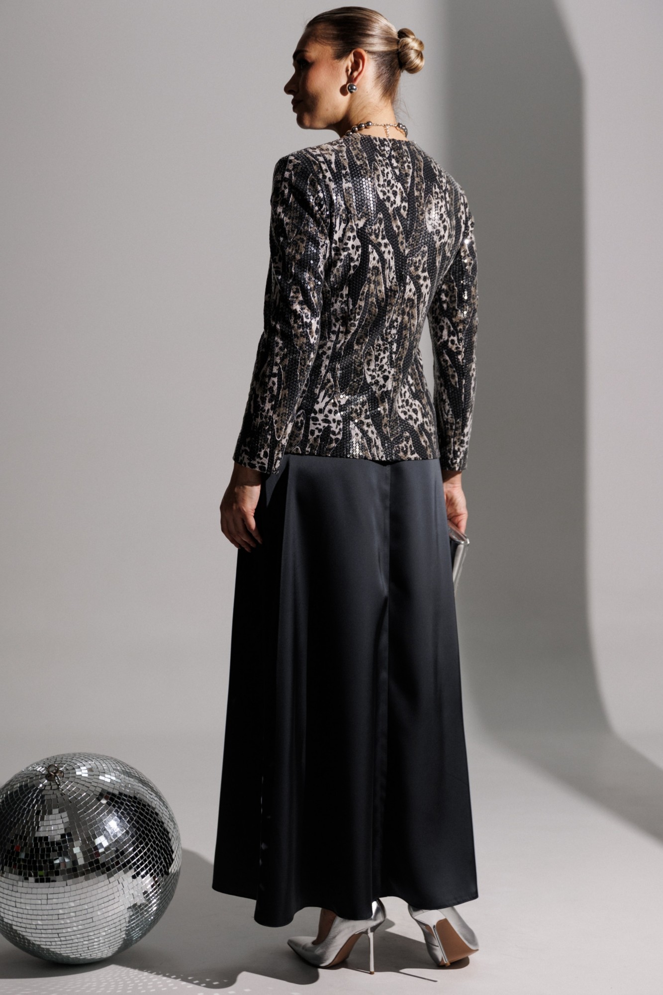 Продолжением нашей нарядной коллекции является роскошный комплект, состоящий из блузы, имитирующей жакет, и невероятной струящейся юбки из атласа длины макси. Блуза из ткани в пайетки с декоративным узлом в области талии. V-образный вырез. Блуза приталенного силуэта с втачными, двухшовными рукавами. Блуза частично на подкладке. Юбка на поясе с резинкой.