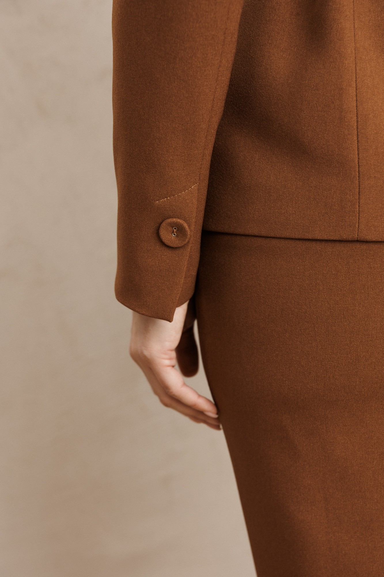 Жакет полуприлегающего силуэта с двубортной застёжкой на одну пару обтяжных, из основной ткани, пуговиц и одной потайной. Край борта фигурной формы, придающей динамичность жакету. На полочке выполнены фигурные рельефы, которые дополнены функциональными карманами, гармонично вписывающимися в общую структуру изделия. Спинка со средним швом и вертикальными рельефами из проймы. Воротник с цельнокроенной стойкой, что придает жакету элегантный и строгий вид. Рукава двухшовные, со шпицей в локтевом шве на одну пуговицу, также обтяжную из основной ткани. Жакет дополнен шлёвками и съемным поясом из основной ткани с пятью блочками на обтяжную пряжку, чем придает дополнительный акцент на талии. Жакет на подкладке. Юбка, длиной ниже колена, зауженная к низу. Застёжка в левом боковом шве на потайную молнию и пуговицу. На переднем и заднем полотнище юбки обработаны талевые вытачки, которые обеспечивают точную посадку по фигуре. Юбка на поясе, сзади частично на резинке для удобства и комфортной посадки. В среднем шве юбки обработана шлица, которая обеспечивает свободу движений. Юбка также на подкладке. В размерах 52-54 застежка смещенная, на три пуговицы. Костюм выполнен из качественной костюмной ткани, что придает изделию прочность и долговечность, а также создает элегантный и современный образ, подходящий для различных деловых мероприятий и повседневной носки.