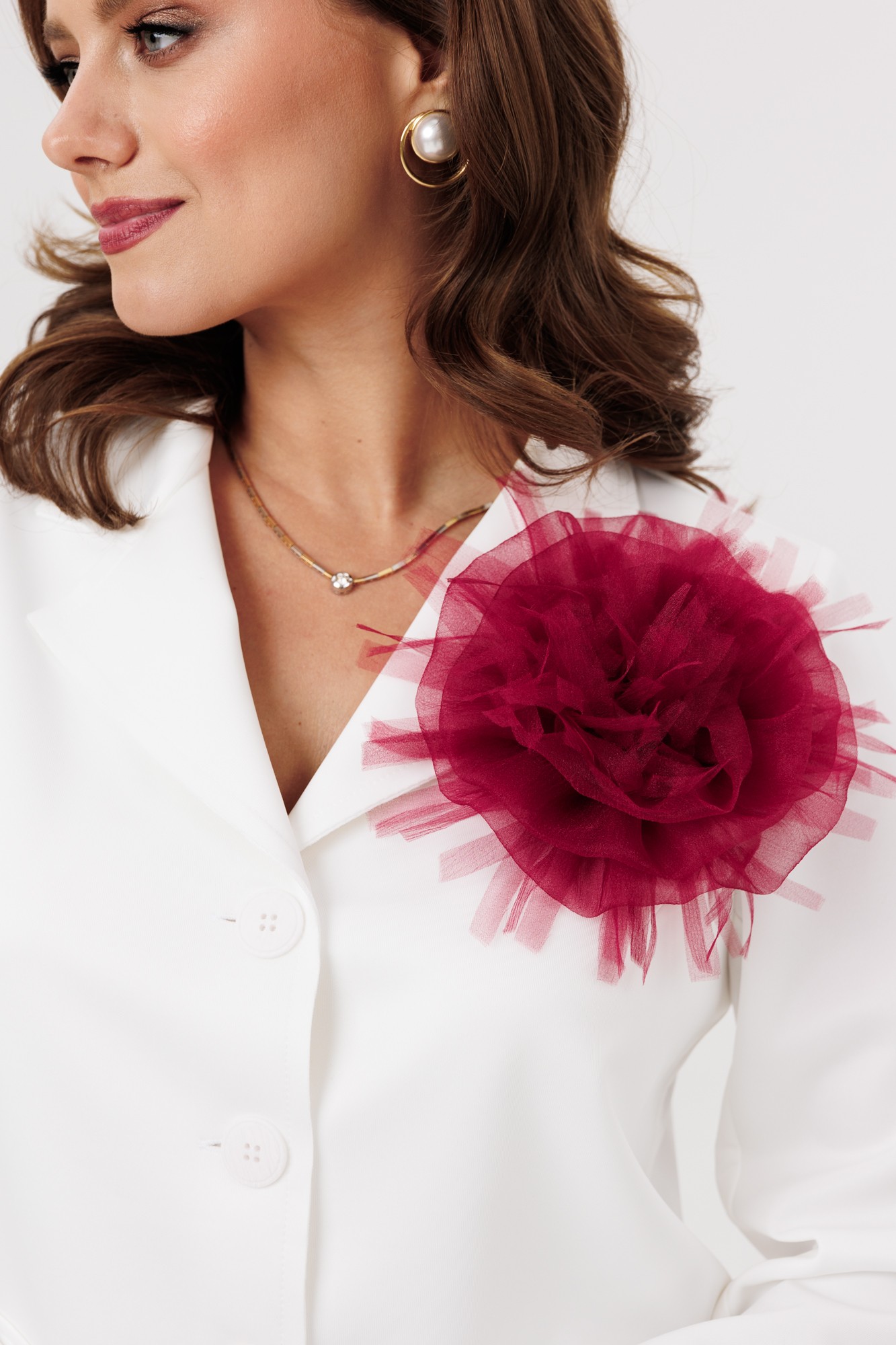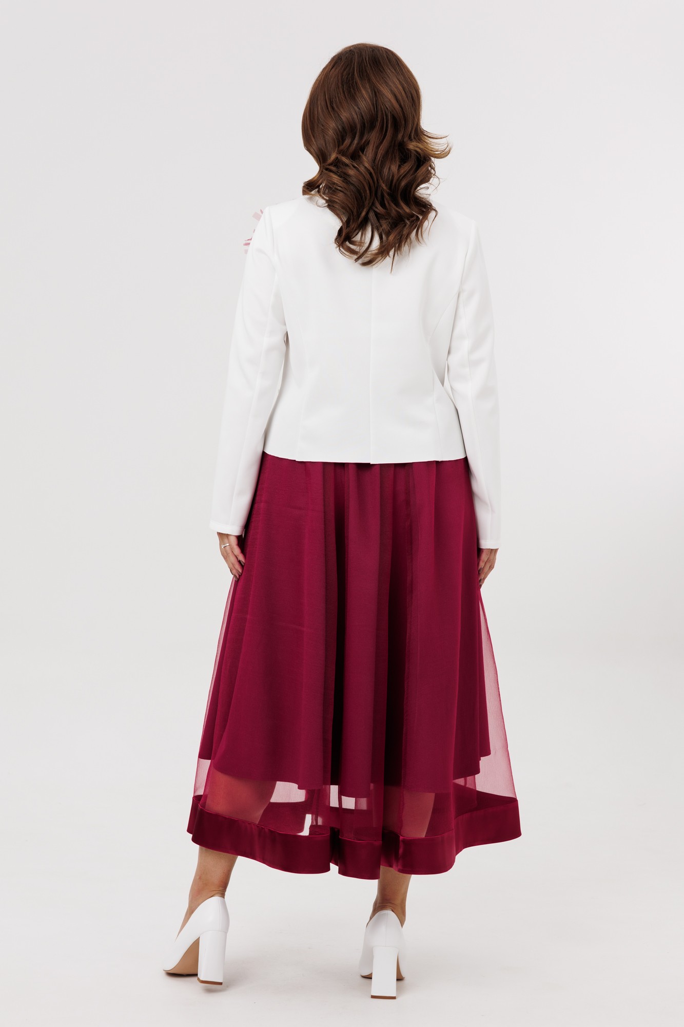 Нарядный женский костюм, состоящий из жакета и юбки. Жакет полуприлегающего силуэта, выполнен из трикотажного полотна (тянется), без подкладки. По переду нагрудная вытачка и отделочный клапан, центральная застежка на петли-пуговицы. Спинка со средними рельефными швами. Рукава втачные, двухшовные. Горловина оформлена воротником пиджачного типа с лацканом. Юбка – 6-клинка, выполненная из двух видов ткани – органзы и атласа (не тянется), на подкладке. По низу клиньев – притачная планка из атласа. Верхний срез оформлен поясом с эластичной резинкой. Жакет декорирован съемным цветком бордового цвета (на булавочке).