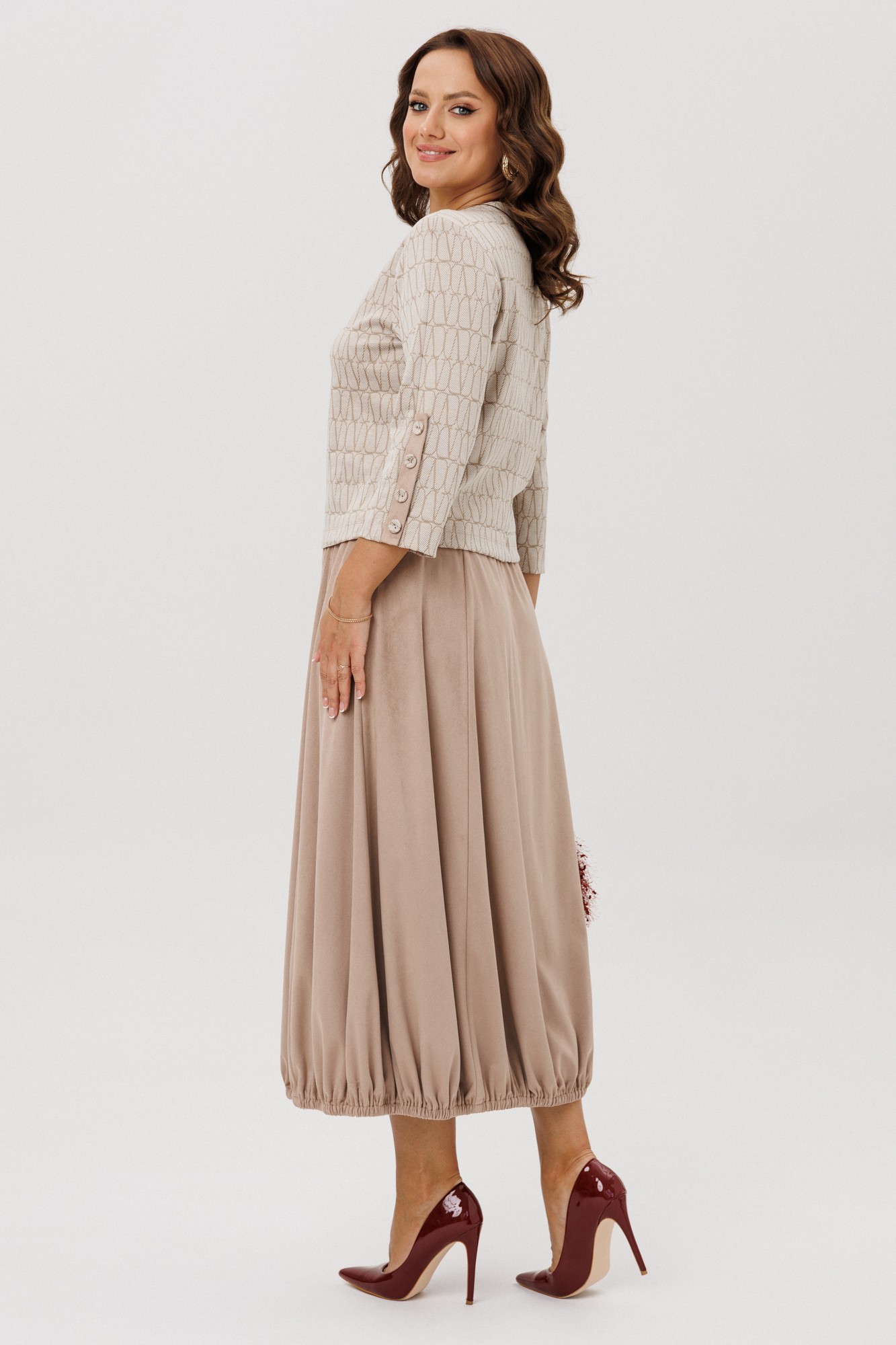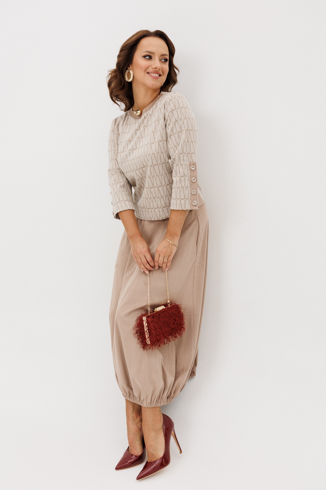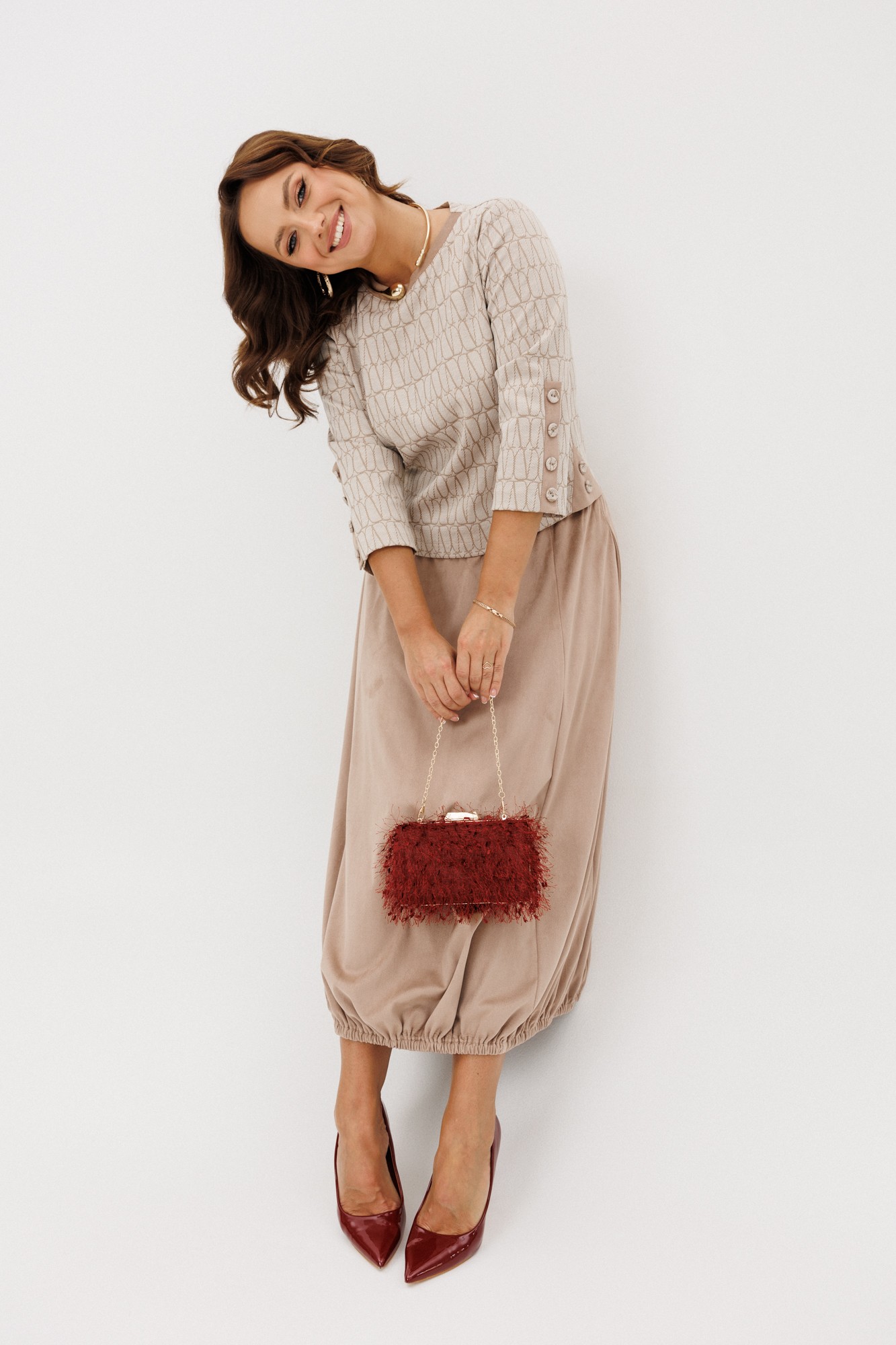 Стильный женский костюм, состоящий из джемпера и юбки. Джемпер полуприлегающего силуэта, выполнен из мягкого трикотажного полотна (тянется) с отделкой из замши. Перед цельный. Спинка со средним швом. Горловина-лодочка оформлена притачной планкой из отделочной ткани. По боковым швам, внизу – отрезные детали треугольной формы из отделочной ткани с декоративными пуговицами. Рукава втачные со швом по середине и планкой из отделочной ткани с декоративными пуговицами. Юбка-баллон без подкладки, выполнена из костюмно-плательной ткани «Замша» (тянется). По переднему и заднему полотнищу вертикальные швы. В боковых швах функциональные карманы. Верхний срез оформлен поясом с эластичной резинкой. Нижний срез – собран резинкой.