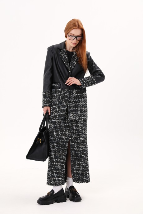 Костюм двухпредметный: состоит из жакета и юбки. Жакет однобортный из комбинированной ткани: шанель и экокожа. Изделие полуприлегающего силуэта, длиной ниже линии бедер. Рукав втачной, двухшовный. Воротник английский. На переде прорезные карманы в рамку с клапаном. Застежка центральная на петли и пуговицы. В среднем шве спинки шлица. Юбка длиной миди прямая на резинке. Карманы в боковых швах. Разрез по переду.