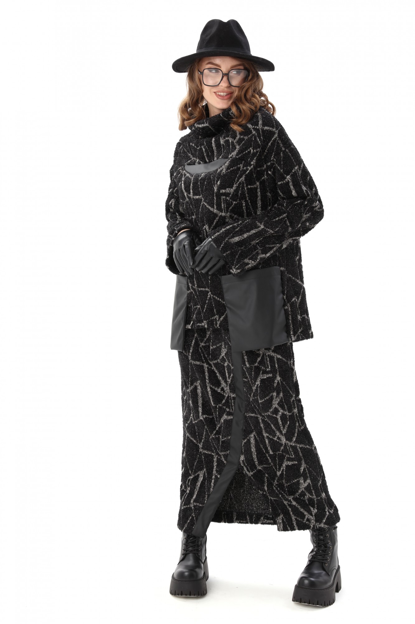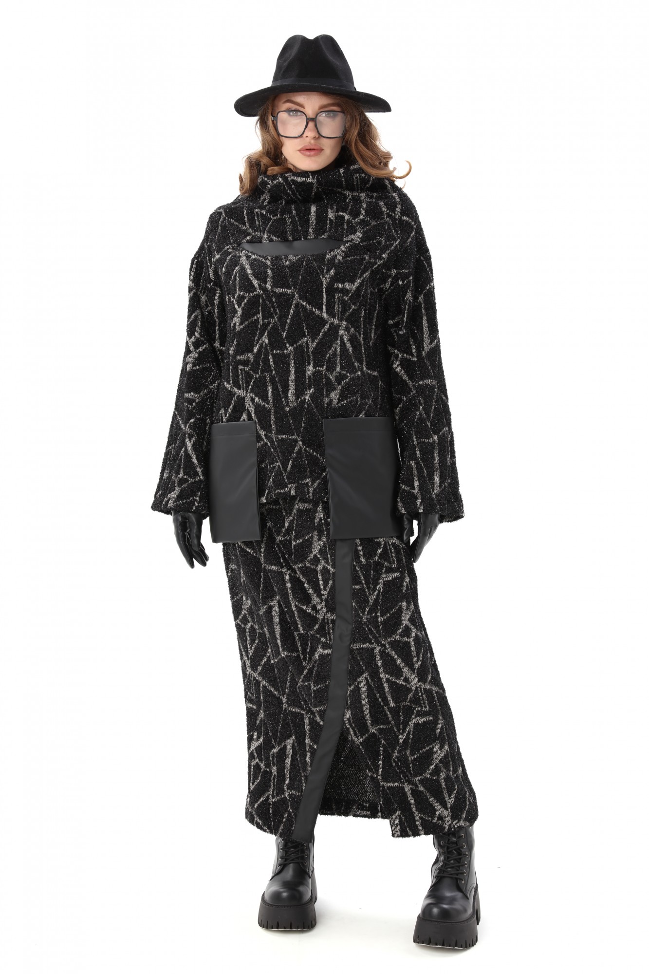 Костюм комбинированный двухпредметный: состоит из джемпера и юбки. Джемпер прямого свободного силуэта длиной до линии бедер, воротник хомут, рукав одношовный, втачной длиной до запястья. Спинка цельнокроеная. Перед состоит из двух частей- верхней и нижней. По нижней части переда сверху по центру вставка из отделочной ткани. По нижней части переда боковые накладные карманы из отделочной ткани, уходящие в боковой шов, длиннее линии низа переда вровень с линией низа спинки. Юбка на резинке прямого кроя с имитацией запаха из отделочной ткани.