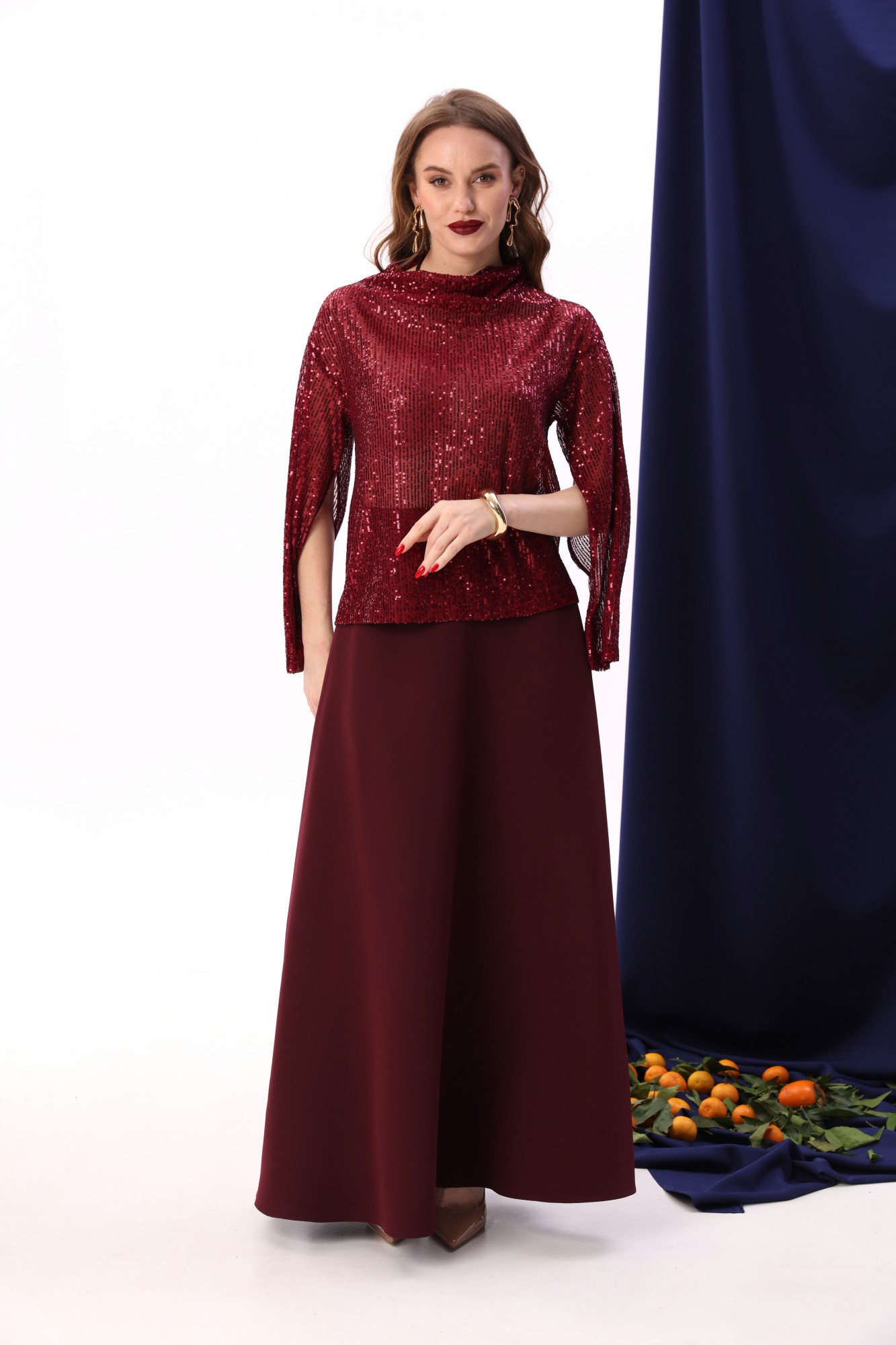 Костюм двухпредметный: состоит из джемпера-кейпа и юбки. Элегантный джемпер-кейп прямого свободного силуэта с спайетками. Горловина с цельнокроеным воротником-стойкой. Рукав втачной широкий, от линии локтя до запястья есть дополнительное отверстие для рук. Юбка - солнце макси с узким поясом. В боковых швах расположены карманы. Застёжка на петлю и пуговицу и молнию по спинке.