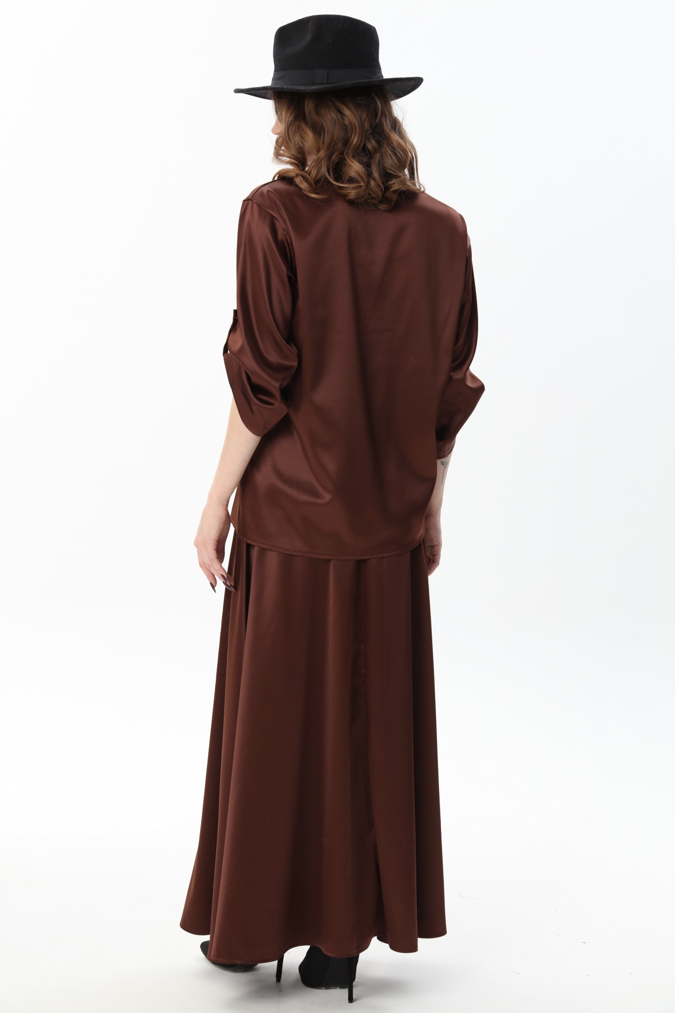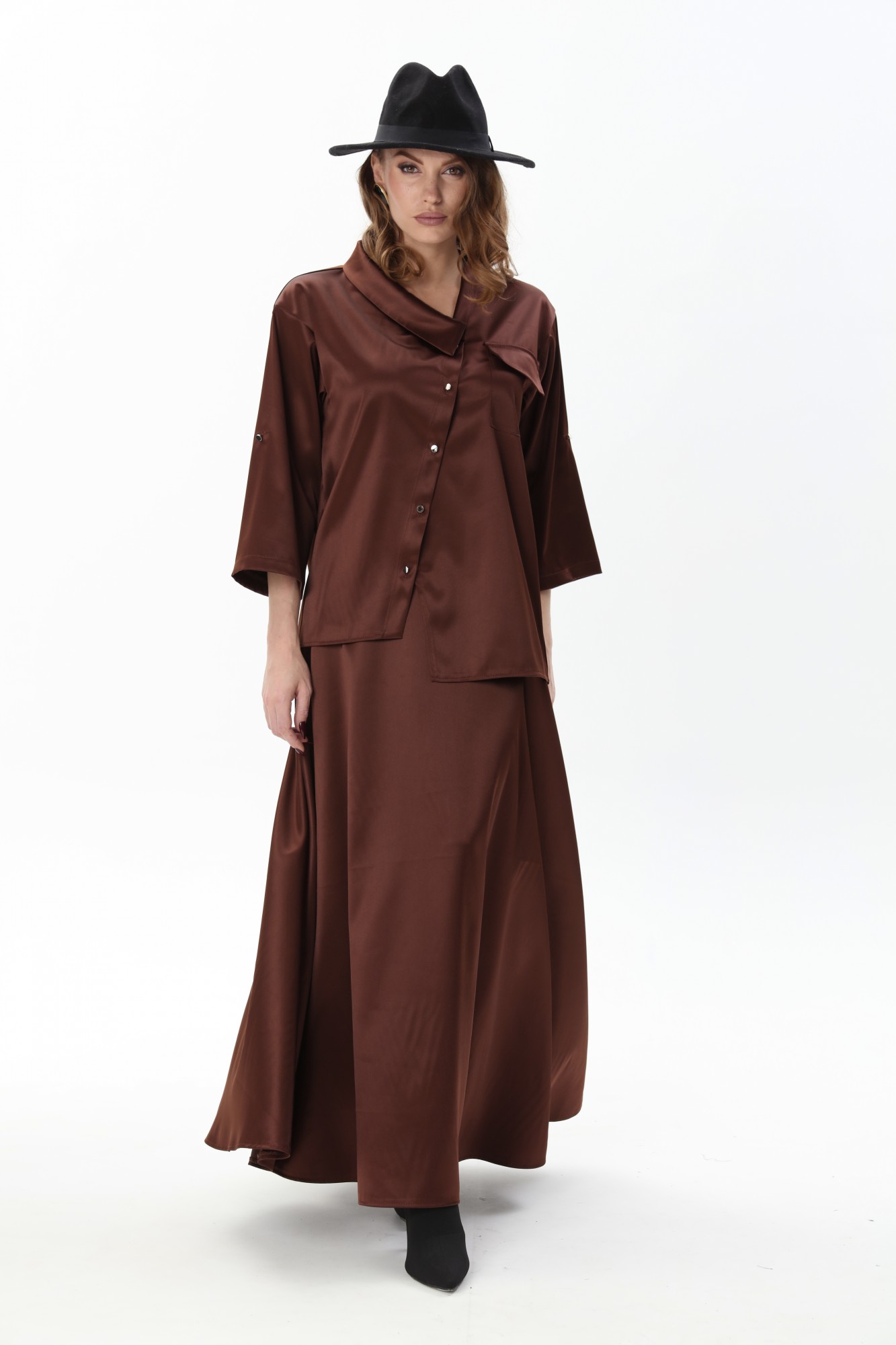 Костюм комбинированный двухпредметный: состоит из жакета и юбки. Жакет рубашечного типа прямого силуэта с асимметричным низом. Рукав втачной со спущенной линией плеча, фиксируется на пату. Застежка центральная на петли и пуговицы, смещённая по косой. На левой полочке накладной карман с клапаном. Воротник отложной на стойке до половины спинки. Юбка - солнце макси с узким поясом. В боковых швах расположены карманы. Застёжка на петлю и пуговицу и молнию по спинке.