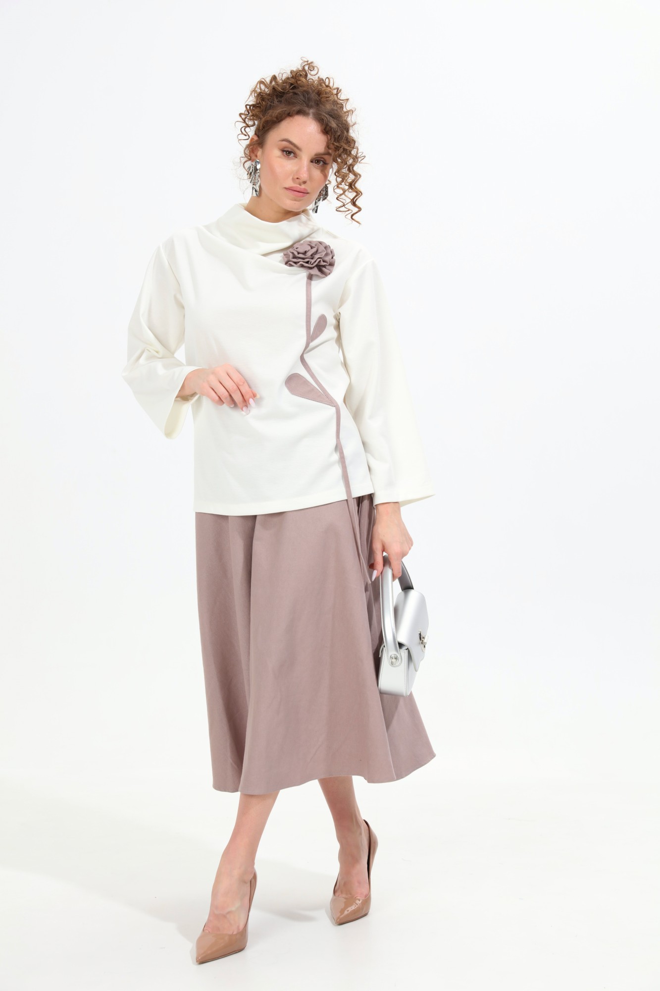 Костюм двухпредметный: состоит из джемпера и юбки. Джемпер-кейп прямого свободного силуэта. Горловина с цельнокроеным воротником-стойкой. Рукав втачной широкий, от линии локтя до запястья есть дополнительное отверстие для рук. Декорирован цветком из контрастной ткани. Юбка - солнце с узким поясом. В боковых швах расположены карманы. Застёжка на петлю и пуговицу и молнию по спинке.