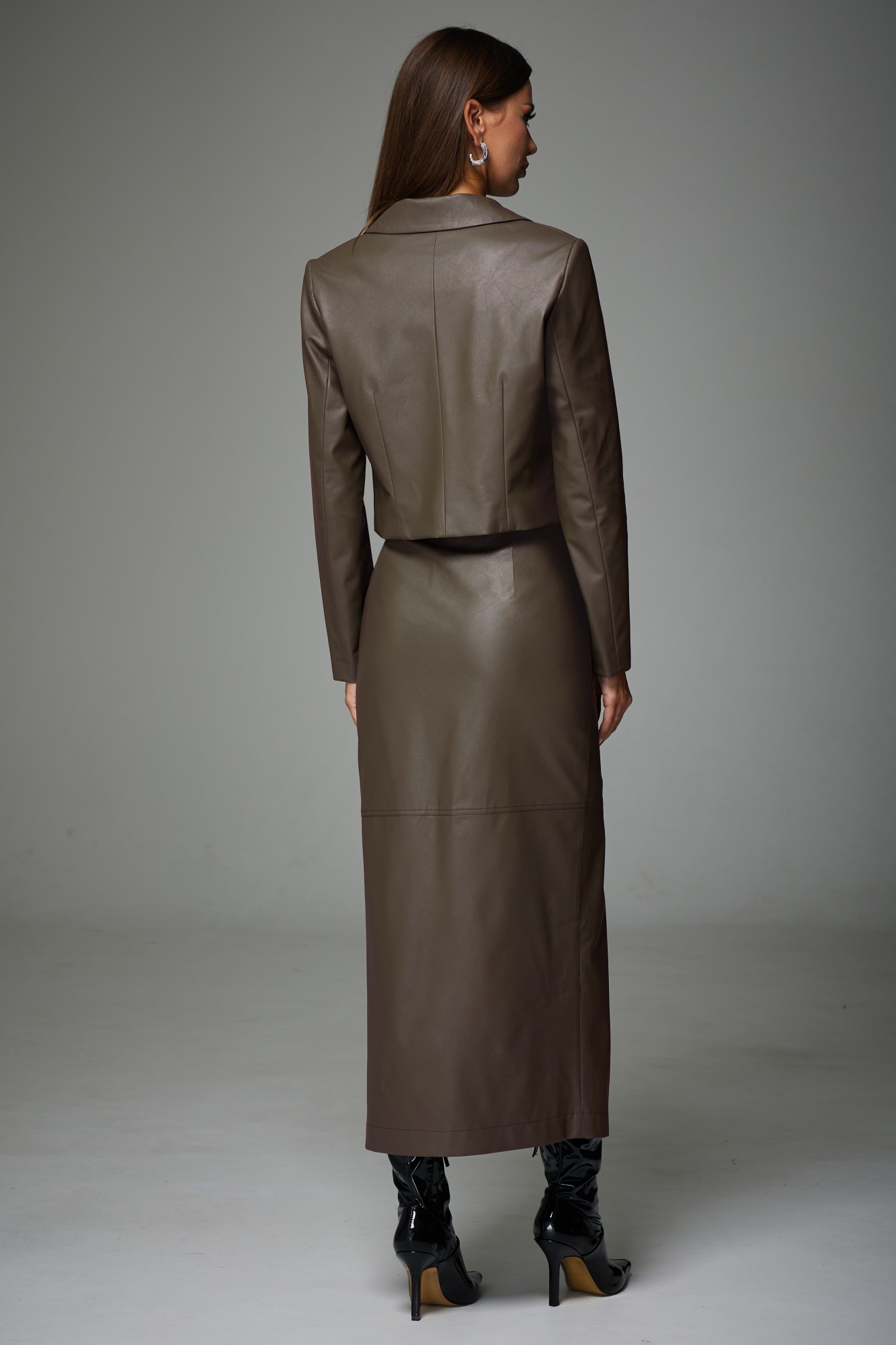 Комплект состоящий из жакета и юбки. Полуприлегающего силуэта, втачного покроя. Выполнен из экокожи на подкладке. Жакет укорочен, закрывает линию талии. Рукав двухшовный, длинный. Горловина обработана воротником пиджачного типа. По переду расположены нагрудные вытачки. Спинка со средним швом и талевыми вытачками. Жакет к низу заужен. Юбка прямого силуэта, к низу заужена. Верхний срез обработан поясом со шлевками для ремня. По переду расположен средний шов с застежкой на гульфик (молния) и разрезом. На переднем и заднем полотнище имеется горизонтальный шов. В боковых швах переднего полотнища расположены карманы закругленной формы. Горизонтальные, вертикальные подрезы, застежка на гульфик, карманы и пояс со шлевками обработаны отделочными строчками.