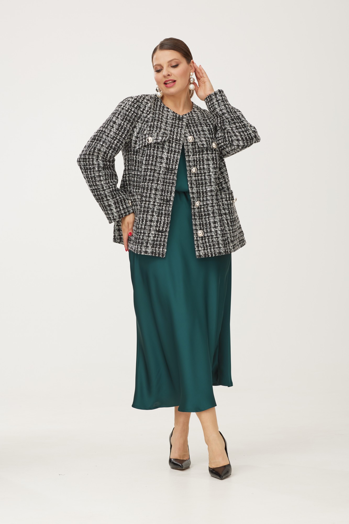 Комплект тройка состоит из жакета, топа и юбки из атласной нарядной ткани. Жакет на подкладке прямого кроя выполнен из рогожки «Шанель». Воротник круглый, Жакет на застёжке на декоративные пуговицы. имеет удобные функциональные карманы, что добавляет практичности. Топ с V-образным вырезом, свободного силуэта из струящейся атласной ткани. Спущенное плечо топа практично прикрывает особенные места в верхней части руки. Модная юбка длины миди представлена тоже в атласной ткани. Юбка свободного кроя, с высокой посадкой, расширена «по косой» от бедер к низу, за счет этого - визуально удлиняет ноги и отлично смотрится на любой фигуре. Юбка на широкой резинке. Она прекрасно подойдет для повседневной носки, так и для работы в офисе. Комплект представлен в двух вариантах: черно-белый жакет и черная атласная двойка (М179) и черно-белый жакет с изумрудной двойкой (М79/1). Это роскошный комплект, превосходно будет смотреться с каблуками как вечерний вариант, который заслуживает каждая женщина. В нем на любом празднике Вы будете чувствовать себя королевой. Внимание! Цветопередача фотографий на Вашем устройстве может отличаться от реальности.