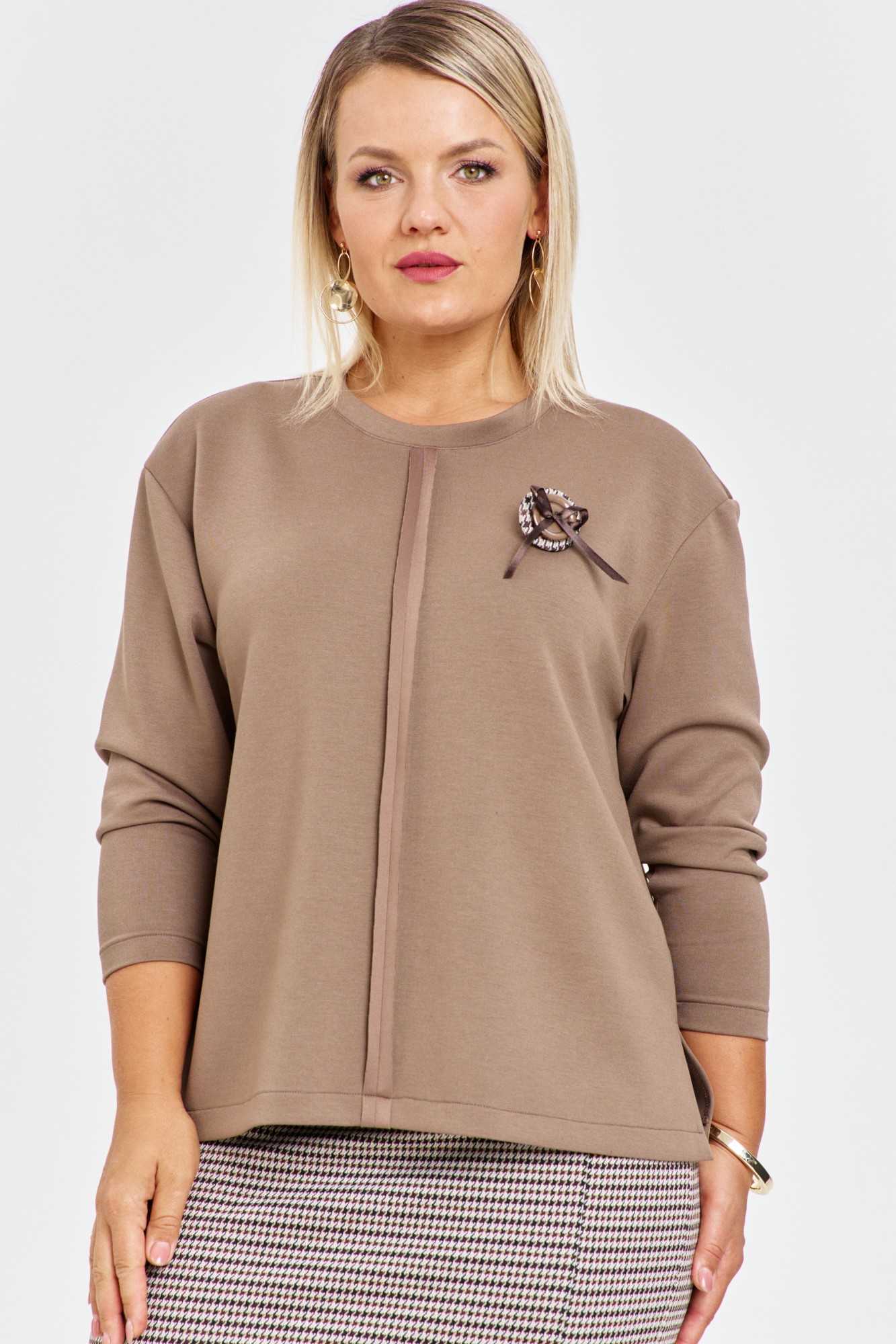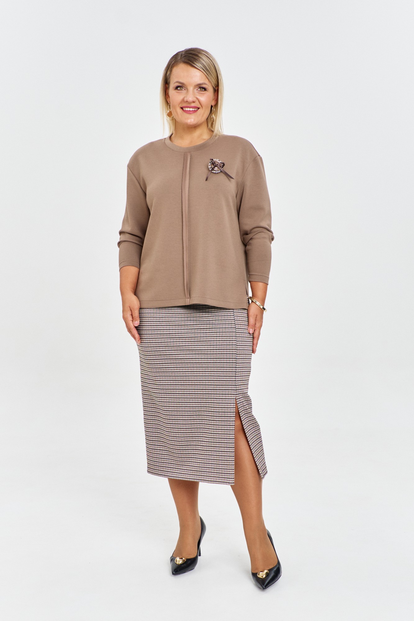 Невероятно комфортный трикотажный комплект состоит из джемпера и юбки. Джемпер свободного покроя с круглой горловиной. Рукав втачной, полномерный по обхвату, на манжете. Для удобства в боковых швах разрезы. Юбка прямого кроя, с разрезом на ноге с высокой посадкой. Пояс притачной на резинке. В боковом шве молния и петля-пуговица. Ткань хорошо тянется и это позволяет вам комфортно себя чувствовать. Съемная брошь ручной работы идет в комплекте. Джемпер (см. арт. 210) и юбка (см. арт. 173) продаются отдельно.