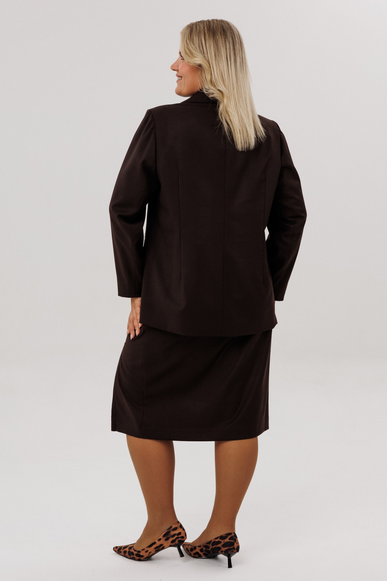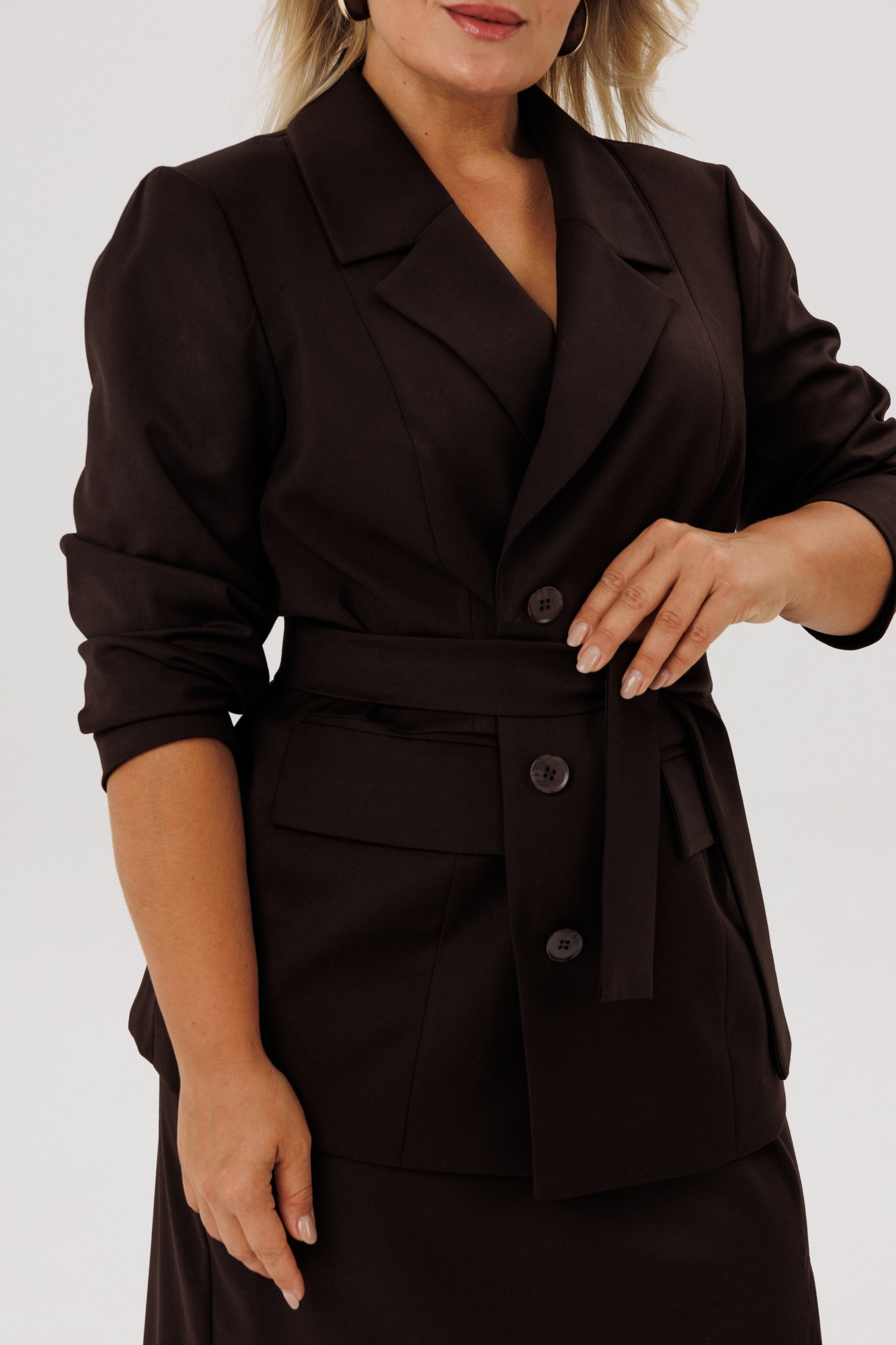 Комплект женский состоит из жакета и юбки. Жакет oversize, однобортный, прямого силуэта на подкладке. Отложной воротник с V-образным вырезом скроет несовершенства и визуально вытянет силуэт, сделает образ модным и стильным. Рукав втачной, двухшовный, полномерный по обхвату. На полочках карманы-клапаны. Отличительным дизайнерским решением являются декоративные пуговицы и съемный пояс. Юбка без подкладки из стрейчевой ткани, свободного покроя, с аккуратным разрезом на ноге. Пояс юбки на широкой резинке, сбоку молния и петля-пуговица.