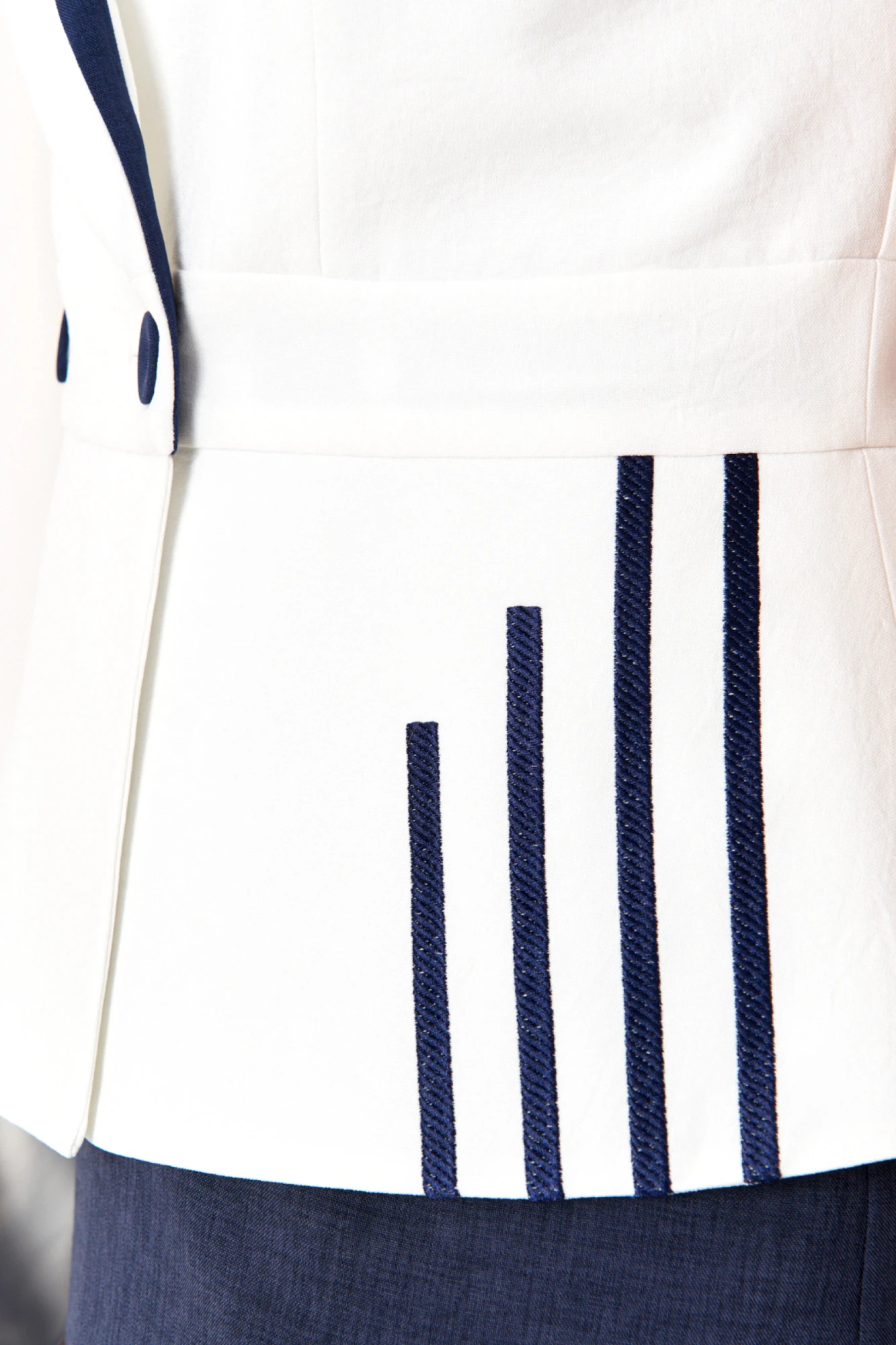 Это женский летний костюм, выполненный из лёгкой ткани с добавлением льна, который обеспечивает приятную свежесть и комфорт в тёплую погоду. В составе костюма входит жакет и прямая юбка. Жакет обладает слегка приталенным силуэтом, созданным за счёт имитации пояса, подчеркнутой отрезной линией по талии. По низу жакета расположена широкая баска, которая добавляет образу женственности и мягкости, создавая плавные линии силуэта. Модель двубортная, выполнена в молочном оттенке, с застежкой на обметанные петли и пуговицы, что придаёт жакету классический и элегантный вид. Передняя часть украшена изящной дизайнерской вышивкой в виде синих полос, которая добавляет нотки оригинальности и шарма. Также на передней части расположены два рельефа, начинающихся от плечевых швов и идущих до линии имитации пояса, что способствует визуальному удлинению и созданию стройного силуэта. Спинка оформлена со средним швом и двумя рельефами, идущими от плечевых швов до нижней линии пояса, что придает изделию дополнительную структуру и аккуратность посадки. Воротник у жакета пиджачный с декоративной вставкой из синей ткани, что служит оригинальным декоративным акцентом. Короткие цельнокроеные рукава завершены аккуратной обработкой, что создает завершённый и строгий вид. Жакет выполнен на подкладке, делая изделие более приятным к телу и повышая его качество. Юбка прямого силуэта синего оттенка, которая гармонично дополняет жакет. Верхний срез юбки обработан притачным поясом со вставкой на резинке в боковой части, что обеспечивает удобство и хорошую посадку. Переднее полотнище юбки украшено двумя талиевыми вытачками, подчеркивающими фигуру. Заднее полотнище также украшено двумя талиевыми вытачками и оснащено средним швом с разрезом, добавляющим изящество и подвижность. В среднем шве юбки расположена потайная застежка-молния, которая аккуратно скрыта и обеспечивает удобство при посадке. Общий стиль костюма сочетает лёгкость, изящество и классическую элегантность, делая его универсальным для различных светских и деловых мероприятий.