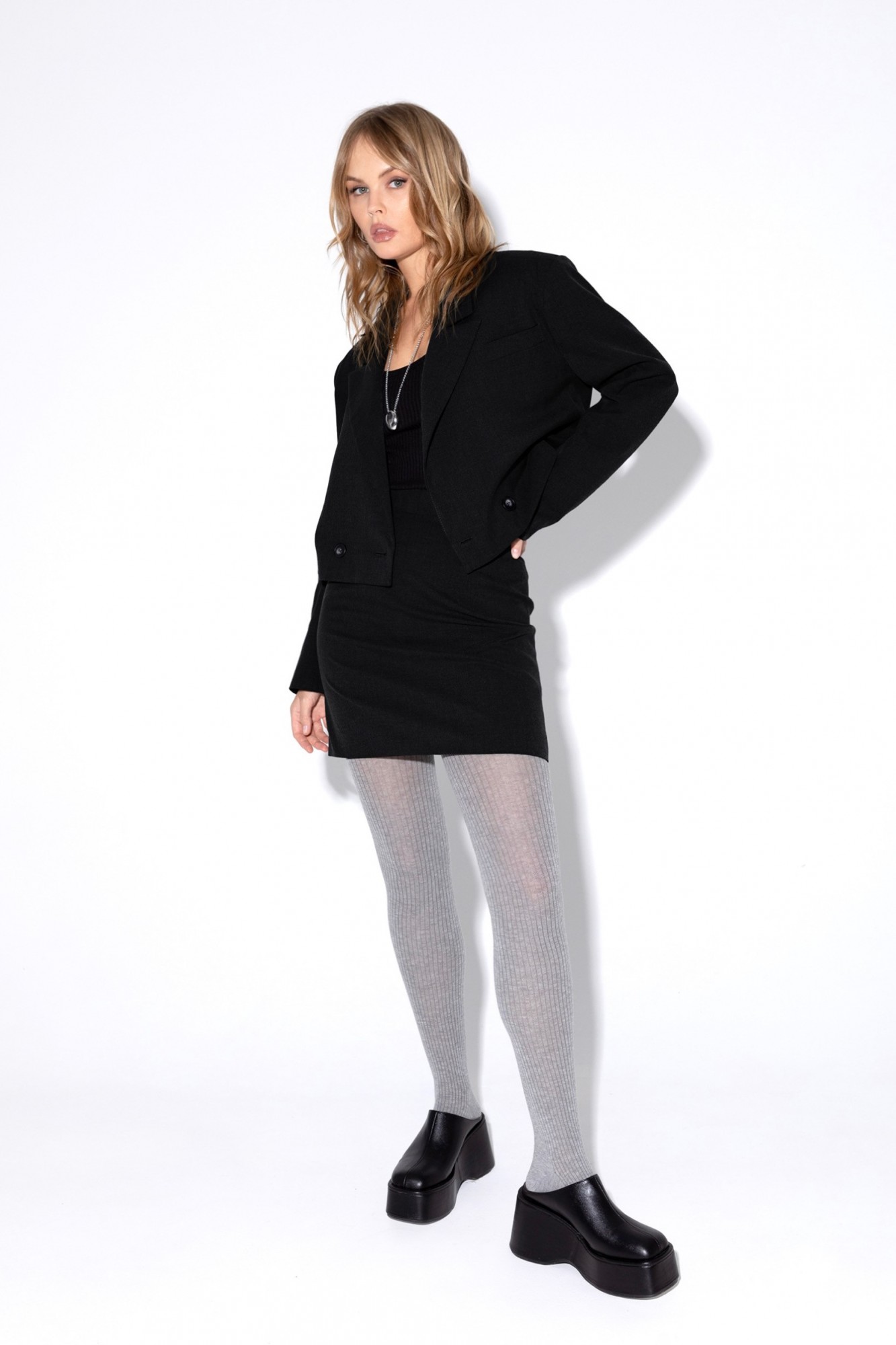 Костюм-двойка из укороченного оверсайз жакета с расширенной линией плеч и прямой мини-юбки с высокой посадкой. Детали: прямой силуэт, спущенная линия плеча, пиджачный воротник, перед с функциональным нагрудным карманом, застежка двубортная на петли и пуговицы, рукава втачные двухшовные, жакет на подкладке. Юбка на притачном поясе, высокая посадка, талиевые вытачки, застежка сзади на потайную молнию, юбка на подкладке.