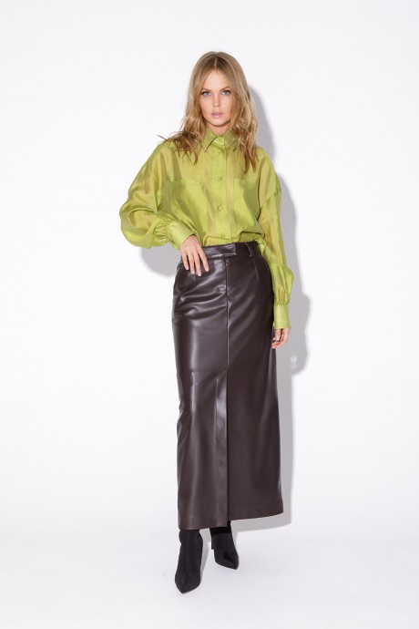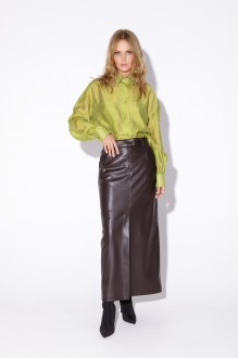 Костюм-двойка из укороченного оверсайз жакета с расширенной линией плеч и прямой макси-юбки с высоким разрезом из экокожи. Детали: прямой силуэт, спущенная линия плеча, пиджачный воротник, перед с функциональным нагрудным карманом, застежка двубортная на петли и пуговицы, рукава втачные двухшовные, жакет на подкладке. Юбка на притачном поясе со шлевками, талиевые вытачки, боковые карманы, застежка на потайную молнию, на подкладке.