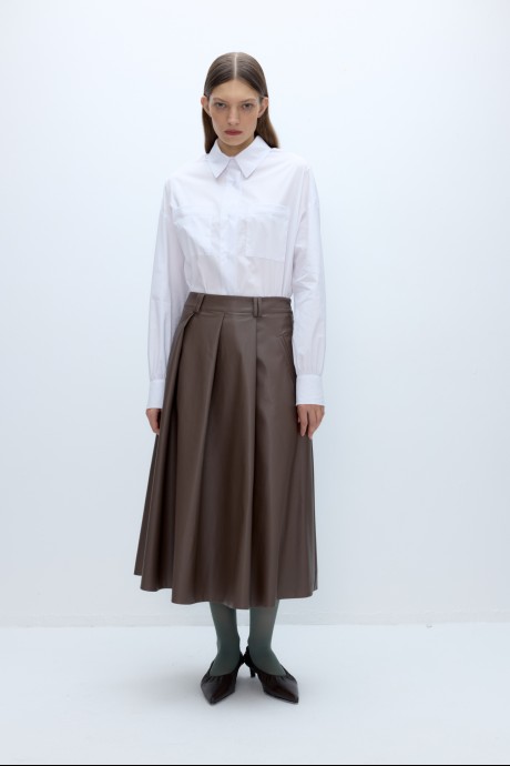 Комплект-двойка из хлопковый оверсайз рубашки и миди-юбки из экокожи. Детали: рубашка прямого силуэта, спущенная линия плеча, застежка на петли и пуговицы, длинные рукава с притачными манжетами, фигурный низ. Юбка на притачном поясе со шлевками, прорезные карманы, застежка на потайную молнию в левом боковом шве, юбка на подкладке.