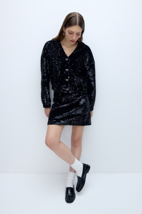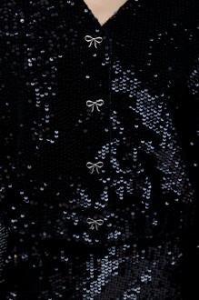 Костюм-двойка из укороченного бомбера и мини-юбки из велюровой ткани в пайетки. Детали: спущенная линия плеча, V-образный вырез горловины переда, застежка на пришивные кнопки и декор в виде бантиков, рукава и низ бомбера на резинке, подкладка. Юбка трапециевидного силуэта, талиевые вытачки, потайная застежка, юбка на подкладке.