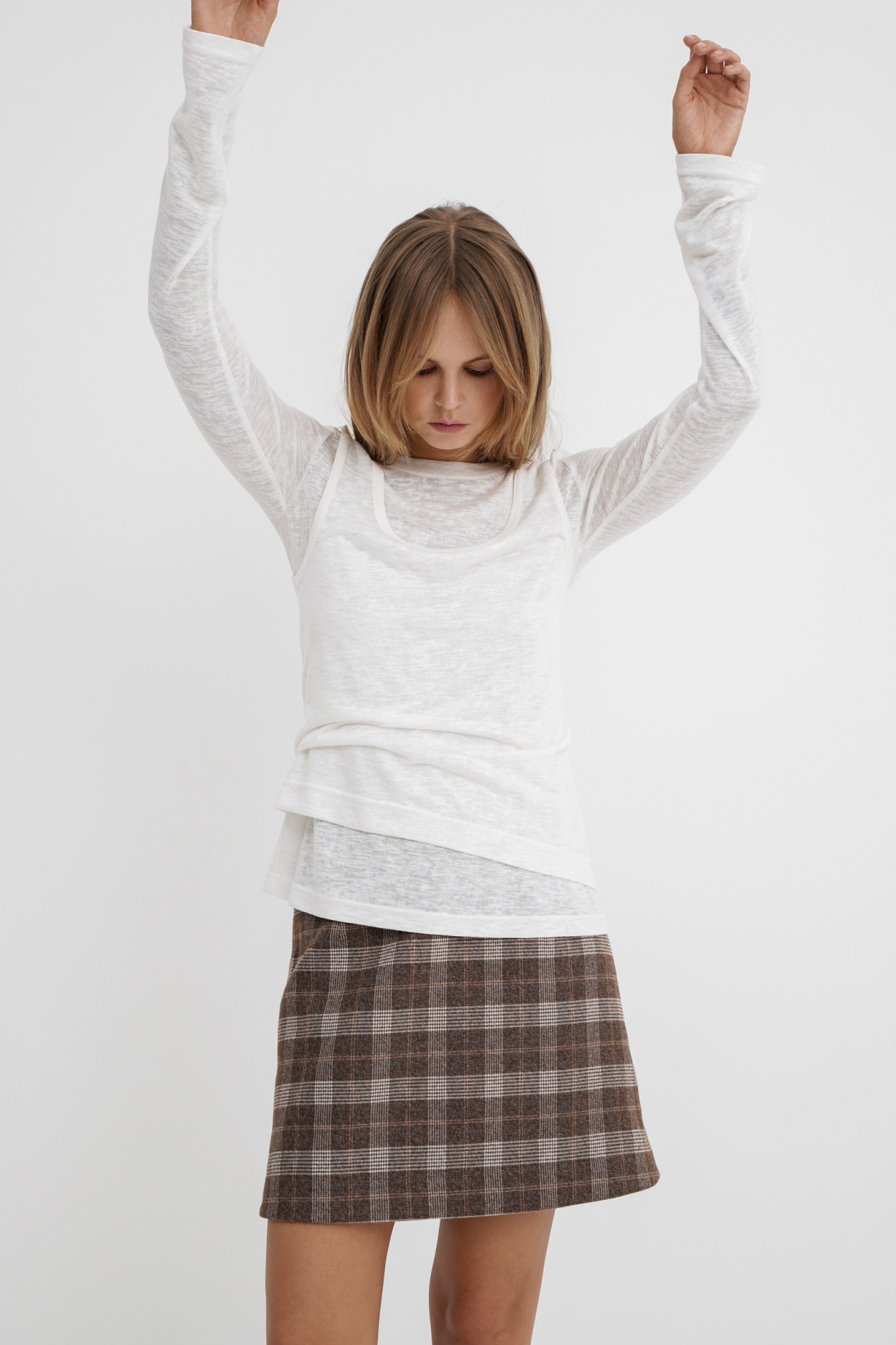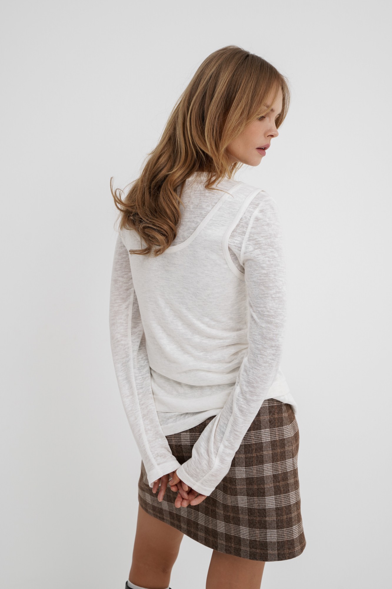 Комплект-двойка из трикотажного лонгслива с майкой и мини-юбки из текстильной ткани в клетку. Детали: лонгслив полуприлегающего силуэта, длинные втачные рукава. Майка съемная. Юбка трапециевидного силуэта, талиевые вытачки, потайная застежка, юбка на подкладке.