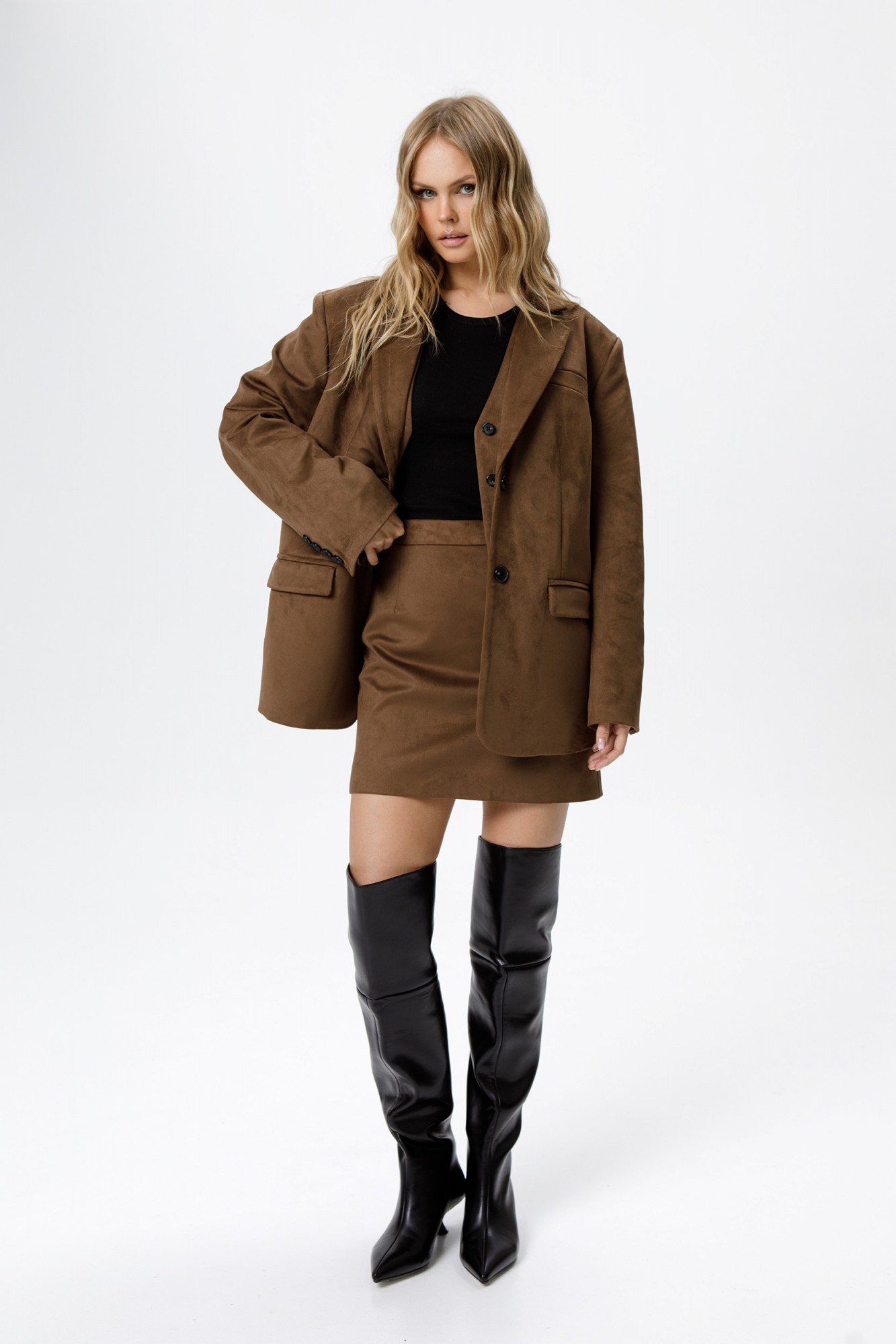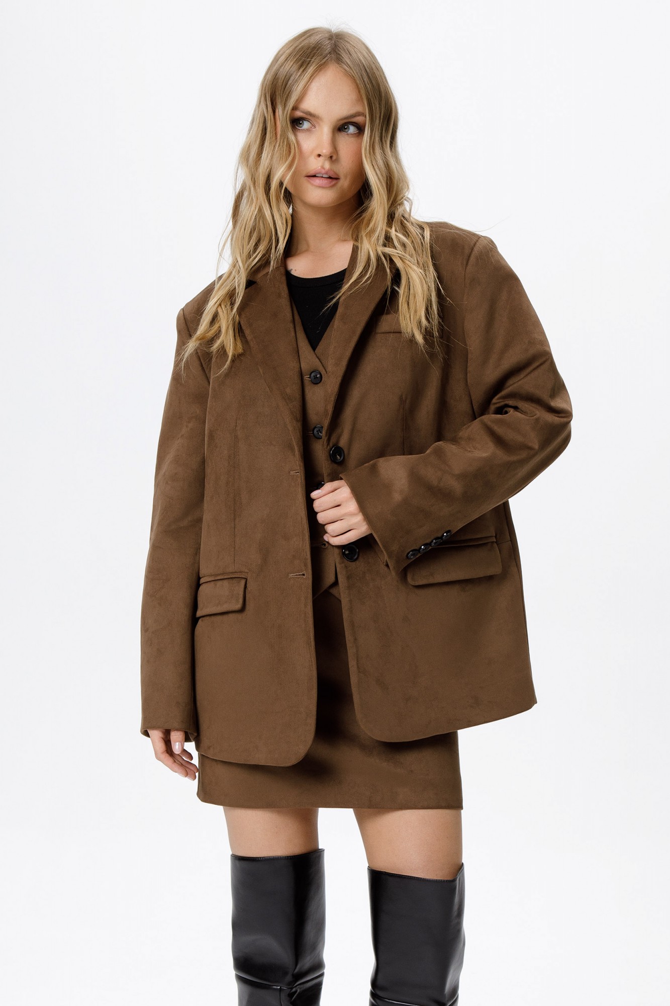 Костюм-двойка из оверсайз жакета и мини-юбки из ткани под замшу. Детали: жакет прямого силуэта, расширенная линия плеч, пиджачный воротник, перед с функциональными карманами, однобортная застежка на петли и пуговицы, спинка со средним швом и шлицей, рукава втачные двухшовные, жакет на подкладке. Юбка на притачном поясе, застежка сзади на потайную молнию, юбка на подкладке.
