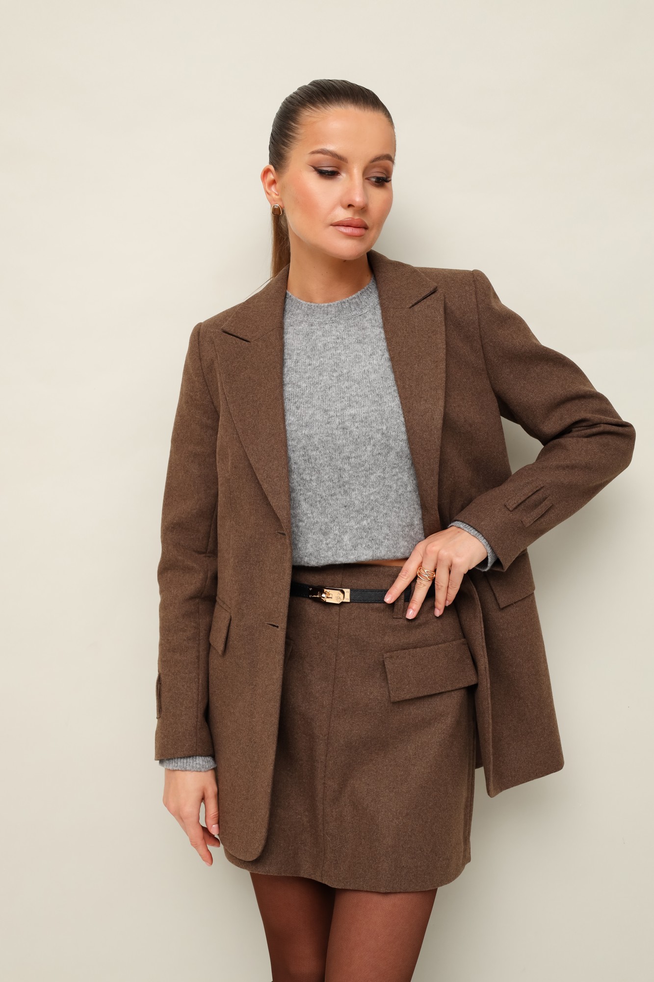 Стильный 2-предметный комплект, состоящий из жакета и юбки-шорт. Комплект выполнен из качественной костюмной ткани. Жакет современного прямого силуэта однобортный, застёгивающийся на петли и пуговицы, край борта скругленный по низу изделия. Воротник пиджачного типа с отложными лацканами. По переду обработаны прорезные карманы в рамку с клапанами. Рукава втачные двухшовные. Спинка со средним швом. Изделие на подкладке. Юбка-шорты в длине мини, на обтачке по поясу спереди и с притачным поясом по спинке. На переднем полотнище обработаны клапаны, имитирующие карманы. Застежка в боковом шве на потайную тесьму-молнию. По низу рукавов жакета и в юбке-шортах по линии талии предусмотрены шлевки. В комплекте прилагается акцентный пояс.