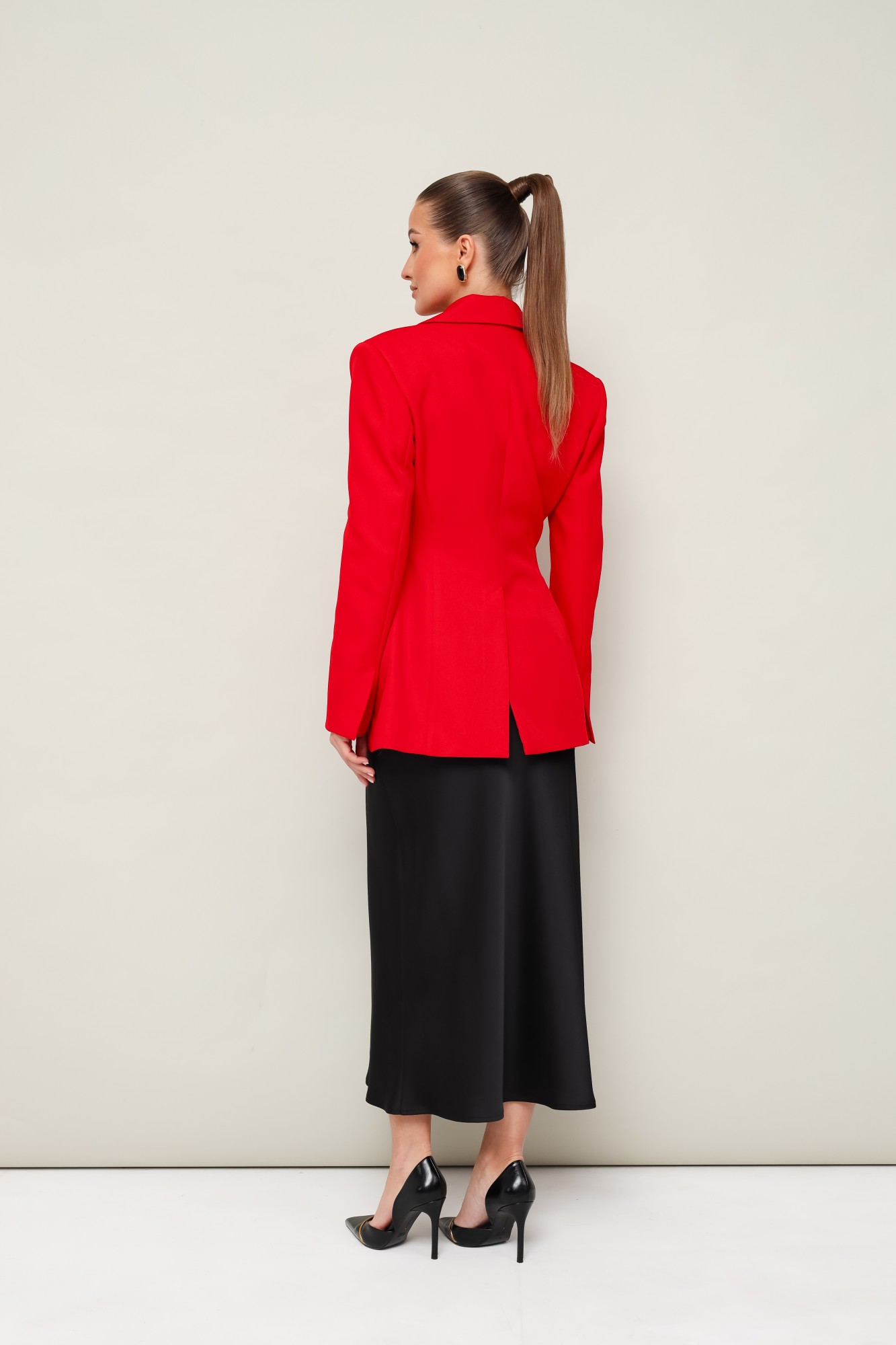 Стильный 2-предметный комплект, состоящий из жакета и юбки. Силуэтный жакет с подчеркнутой линией талии. Смещенная застежка на петлю и пуговицу. Воротник пиджачного типа с отложными лацканами, край борта скругленный по низу жакета. Спереди обработаны прорезные карманы в рамку с клапанами и нагрудный прорезной карман с листочкой. Рукава втачные, двухшовные с отлетнымм шлицами. Спинка с рельефами и средним швом, переходящим в шлицу. Жакет на подкладке. Юбка с кроем «по косой» в длине миди, пояс на обтачке, застежка в боковом шве на потайную тесьму молнию. В комплекте прилагается ремень с акцентной пряжкой.