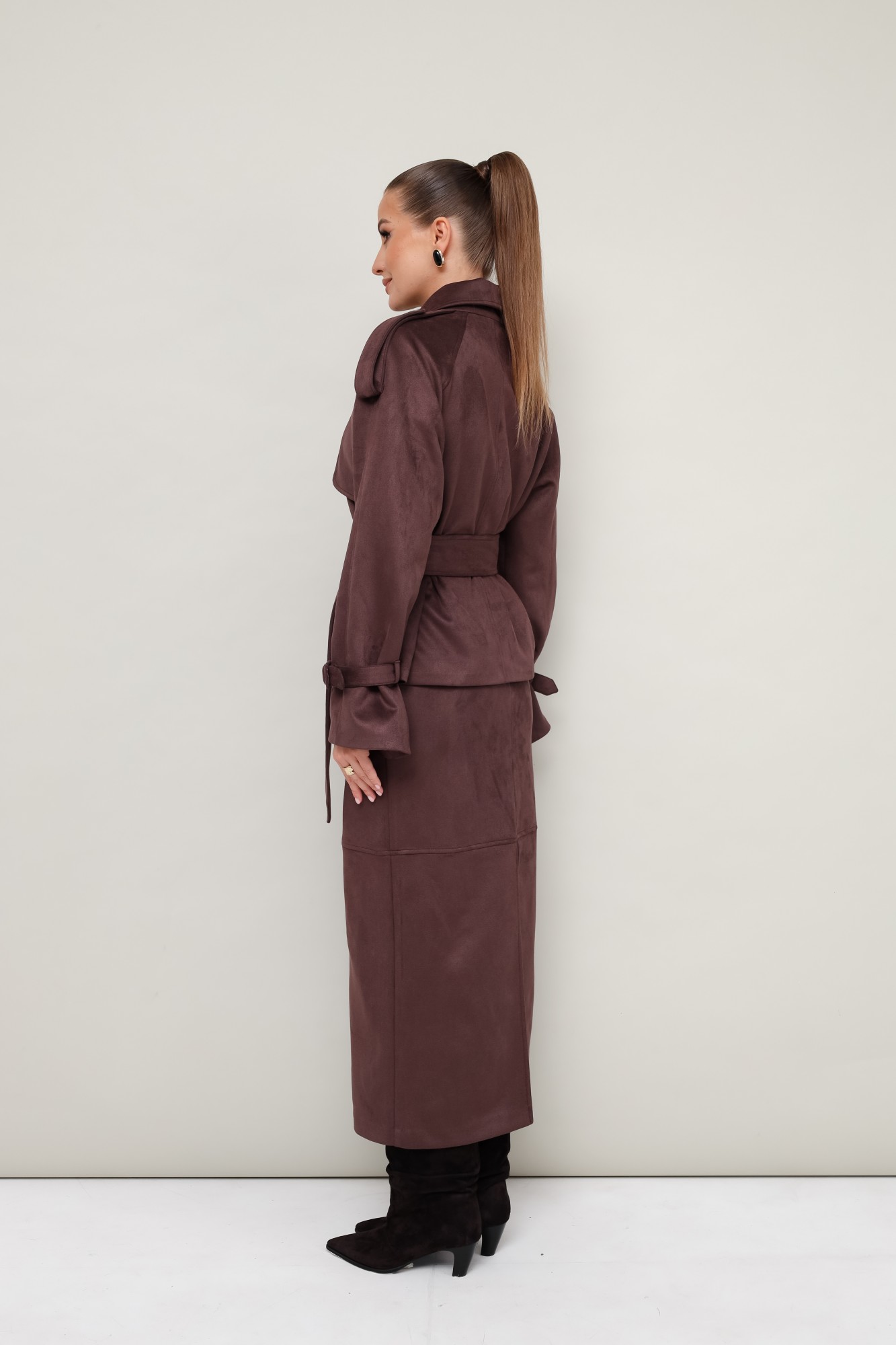 Стильный 2-предметный комплект, состоящий из жакета и юбки, выполненный из экозамши. Жакет современного прямого силуэта, двубортный с застежкой на петли и пуговицы. По плечевому шву обработаны погоны. Воротник пиджачного типа с отложными лацканами. Спереди отлетная кокетка. Рукава кроя реглан, с патами по низу, с фиксацией на пряжки. Спинка со средним швом. Изделие на подкладке. В комплекте пояс из основной ткани с пряжкой. Юбка на подкладке в длине миди с боковыми наклонными карманами. Притачной пояс с застежкой в среднем шве по спинке на пуговицу и потайную молнию. Для удобства движения сзади обработана шлица.