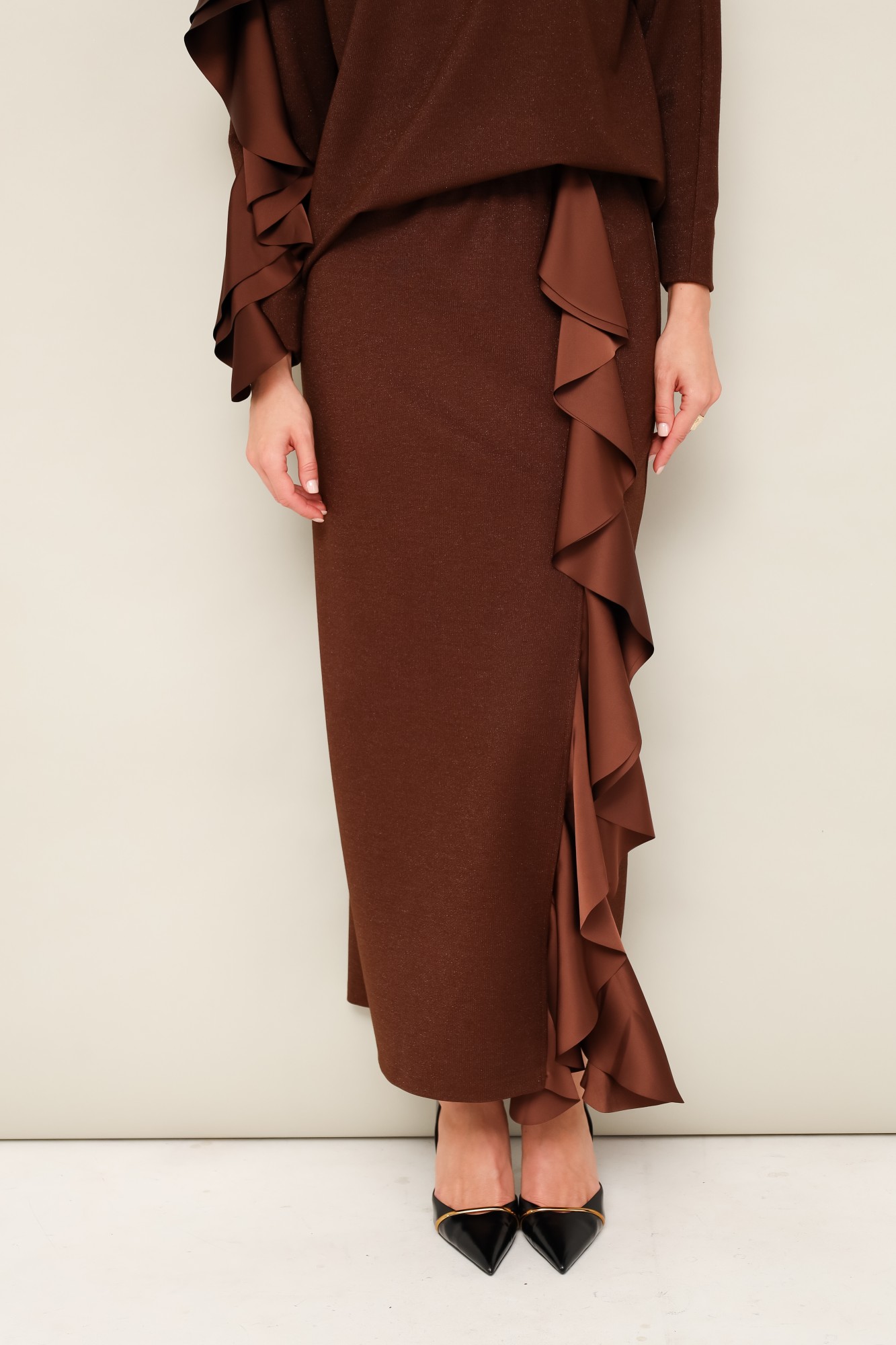 Комплект декорирован двойным сатиновым воланом по плечевому шву, рукаву и по вертикальному подрезу в юбке.