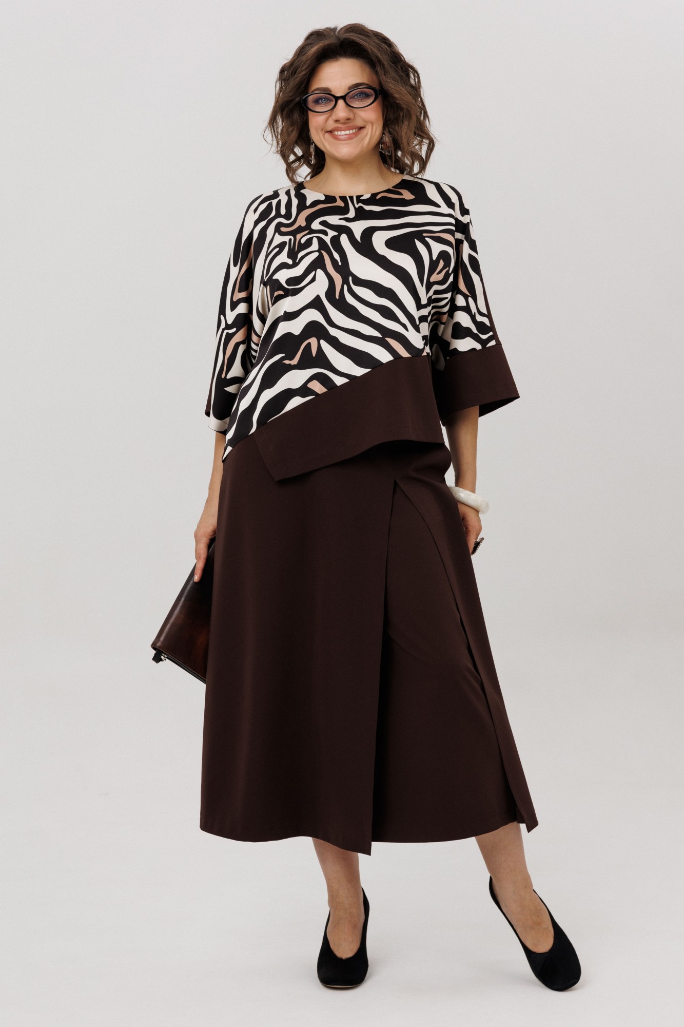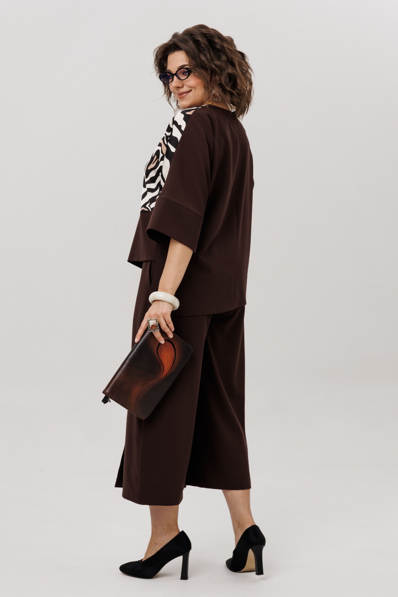 Вероятно, это именно тот костюм, который вы так долго искали. Сочетание строгого силуэта и лёгкой небрежности в цвете «каменные горы». Блузон свободно обрисовывает фигуру, смягчая линии цельнокроеными рукавами. А его главная деталь - фигурный, словно волной очерченный низ, который придаёт статичному крою неожиданную динамику. Низ костюма это юбка-брюки-кюлоты на высокой талии, струящиеся и расклешённые. Модель на запах с мягкими складками создаёт ощущение простора и лёгкости, а скрытые, фигурные карманы в швах берегут чистоту линий. Этот ансамбль от Анелли дышит той особой роскошью, что заключена в безупречной свободе и универсальности. Он готов стать центром вечернего праздника, но с той же уверенностью будет сопровождать вас в будни, будь то деловая встреча или прогулка по городу. И каждая вещь, самостоятельно сочетаясь с другими предметами гардероба, раскрывается с новой стороны, предлагая бесконечные возможности для стиля. Приобрести юбку-кюлоты можно отдельно, артикул 1783.