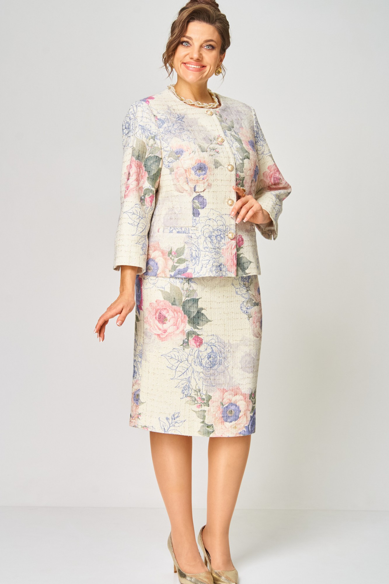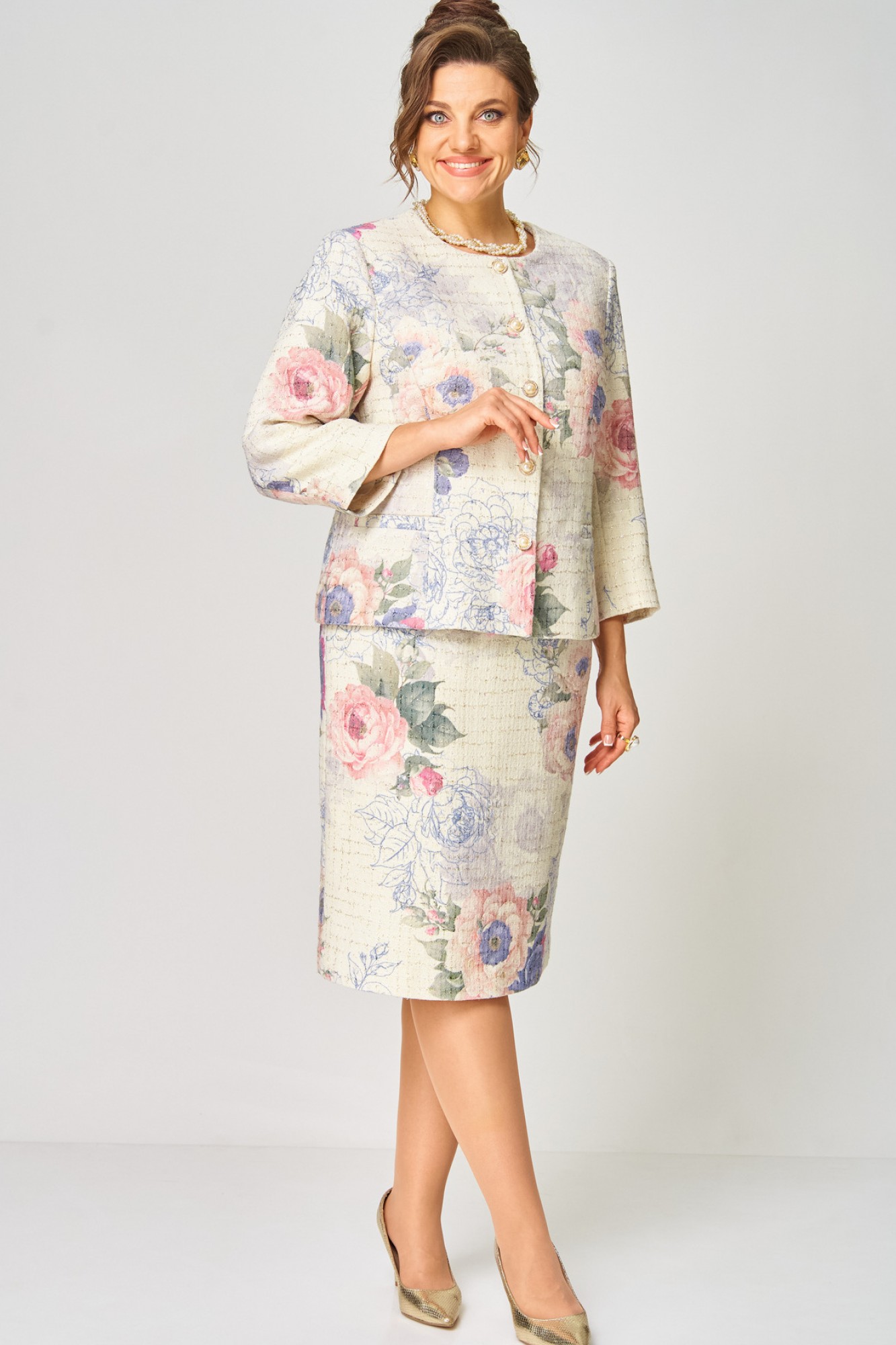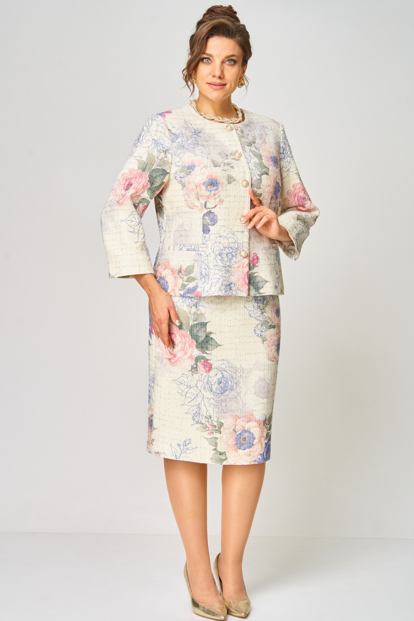Юбочный костюм БелЭльСтиль 861+557 молочный, цветы