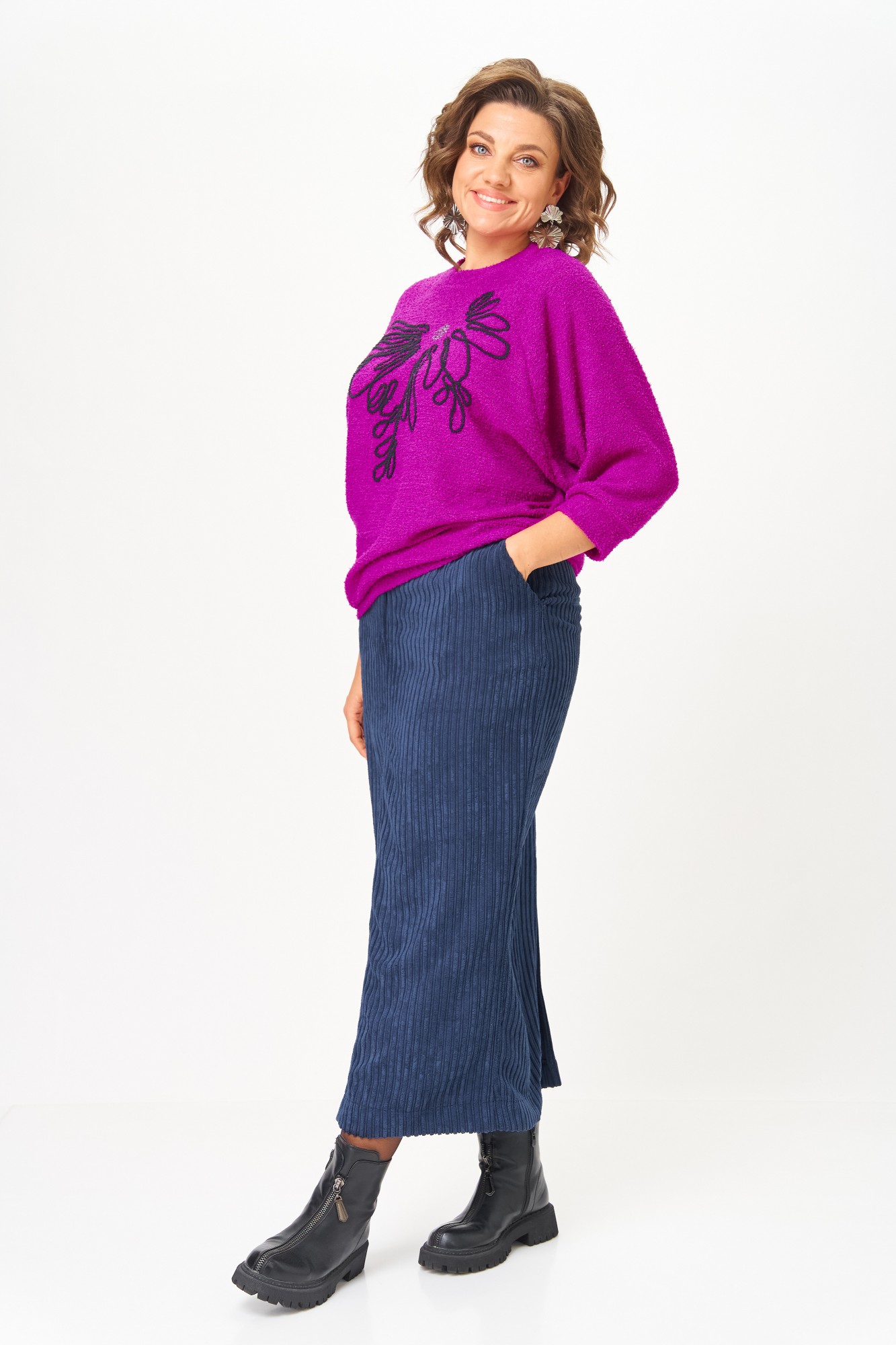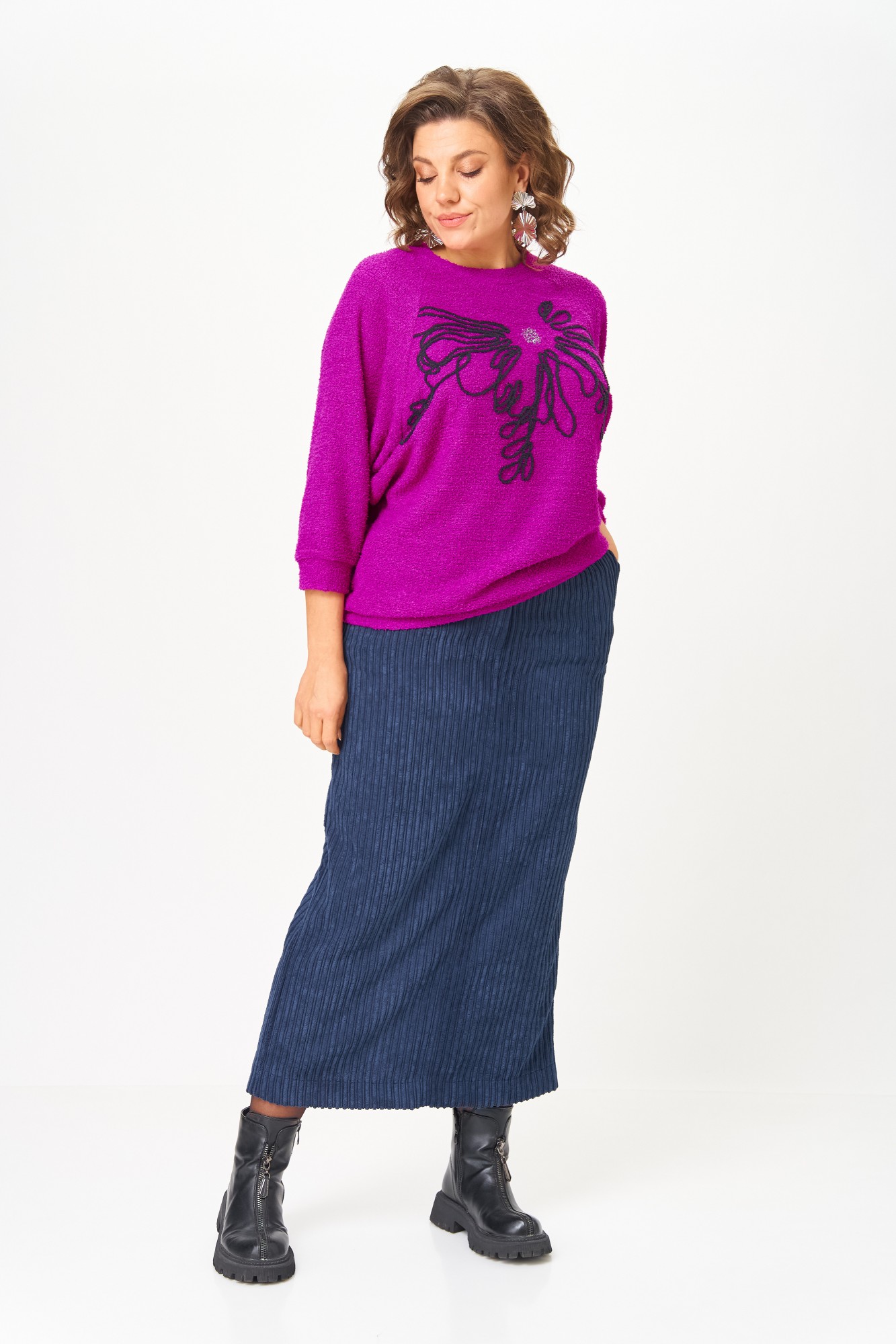 джемпер — 78% ПЭ, 20% нейлон, 2% спандекс, юбка — 86% полиэстер, 14% вискоза