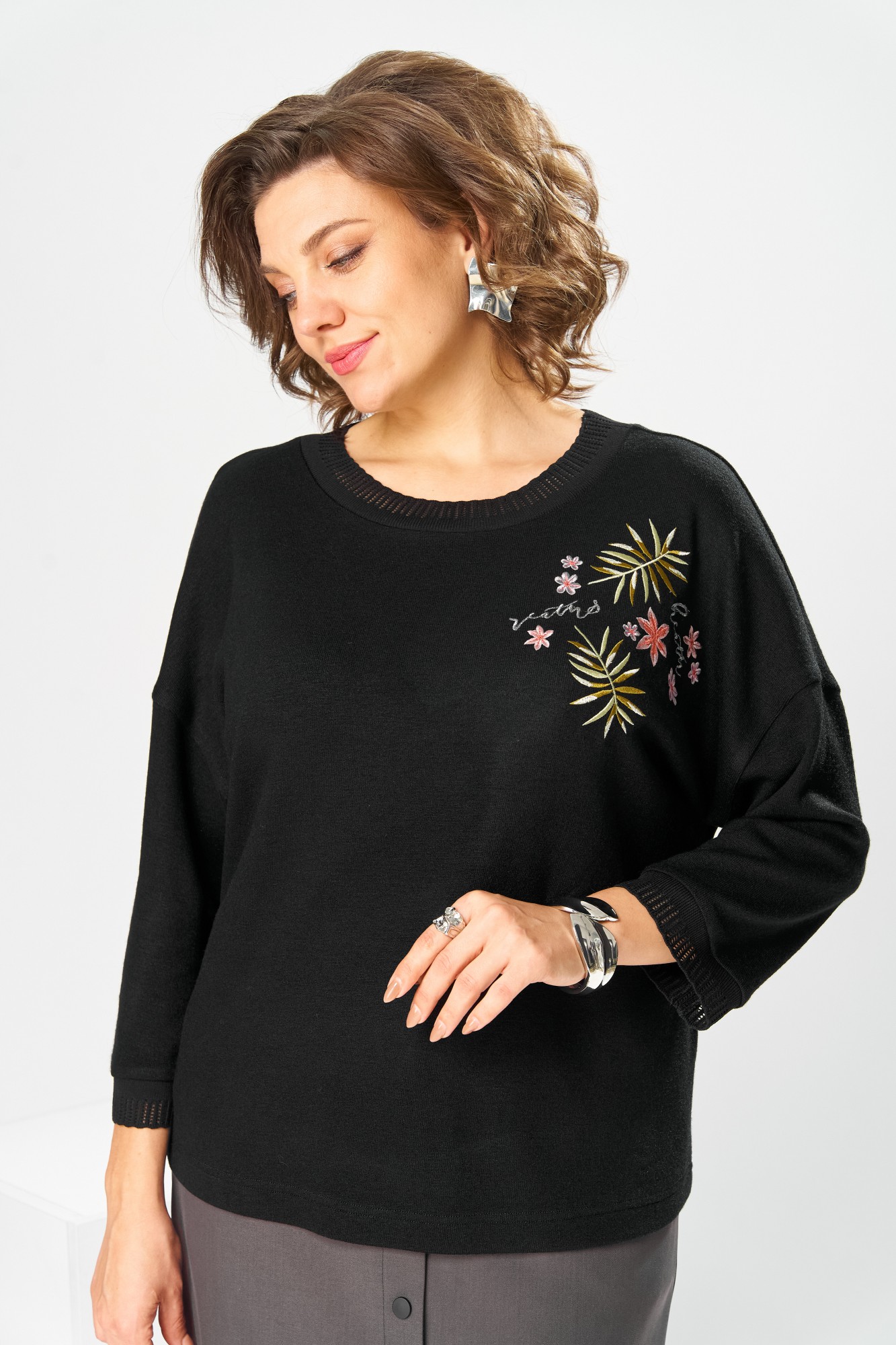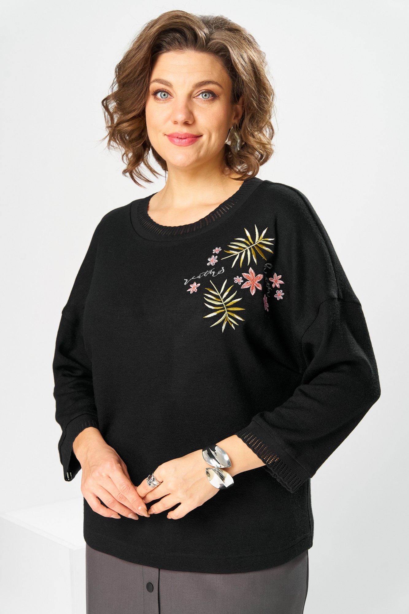 Костюм женский двух предметный: джемпер и юбка предназначен для повседневной носки. Джемпер прямого силуэта, длиной до линии бедер. Перед цельнокроеный, декорирован худ. Вышивкой. Спинка цельнокроеная. Горловина круглая, с втачной фигурной планкой из отделочной ткани. Джемпер со спущенной проймой. Рукав втачной, одно шовный, длиной 7/8. Юбка прямая, длиной ниже колена. Переднее полотнище с двумя боковыми фигурными карманами. Заднее полотнище с двумя таллиевыми вытачками. Застежка спереди на 8 металлических кнопок. Верхний срез с притачным поясом, с 4 надстрочными шлевками, между карманами и вытачками заднего полотнища пояс собран на эластичную тесьму. Юбка на подкладке.