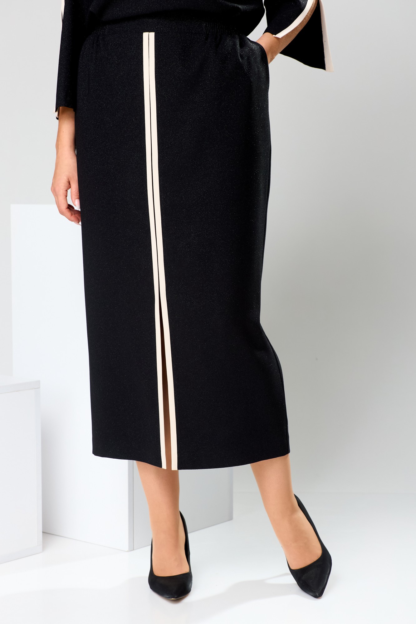 Костюм женский, 2ух-предметный, блузон и юбка. Блузон женский, прямого силуэта, длиной до линии бёдер. Перед с 2-мя нагрудными вытачками, с отделочной планкой по горловине. Спинка цельнокроеная. Горловина круглая, без воротника, обработана косой бейкой из отделочной ткани шириной 1,2 см. Блузон со спущенным плечом. Рукав втачной 2-х шовный, длиной 3/4. Срезы верхнего шва обработаны косой бейкой из отделочной ткани шириной 1,2 см и закреплены частично на планке, верхний шов заканчивается разрезом. Юбка женская ""карандаш"" длиной до нижней части икры. Переднее полотнище с карманами в боковых швах, со средним швом, заканчивающимся разрезом, срезы среднего шва обработаны косой бейкой из отделочной ткани, шириной 1,2 см и закреплены на планке. Заднее полотнище с 2-мя таллиевыми вытачками. Юбка с притачным поясом, собранным на эластичную тесьму, закреплённую 2-мя отделочными строчками. Юбка на подкладке.