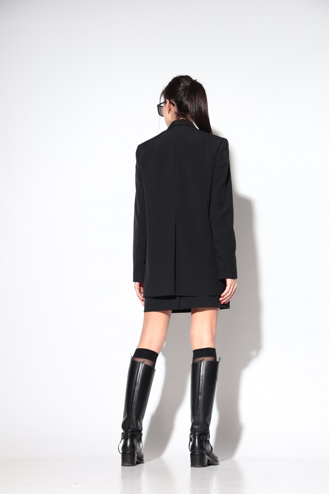 Стильный костюм, состоящий из жакета и юбки. Жакет удлиненный, прямого свободного кроя, на подкладке. Воротник пиджачного типа с отложным лацканом. Спереди прорезные карманы в рамку, на левой стороне полочки жакета вышивка контрастными нитками, имитирующая листочку. Спинка со средним швом и высокой отлетной шлицей (38 см). Рукав втачной, двухшовный, по переднему шву с открытой щлицей. Юбка прилегающего силуэта на подкладке. Застежка потайная тесьма-молния в среднем шве заднего полотна изделия. По заднему шву открытая щлица. Длина жакета по среднему шву спинки 77 см. Длина рукава 62 см. Длина юбки с поясом 47 см.
