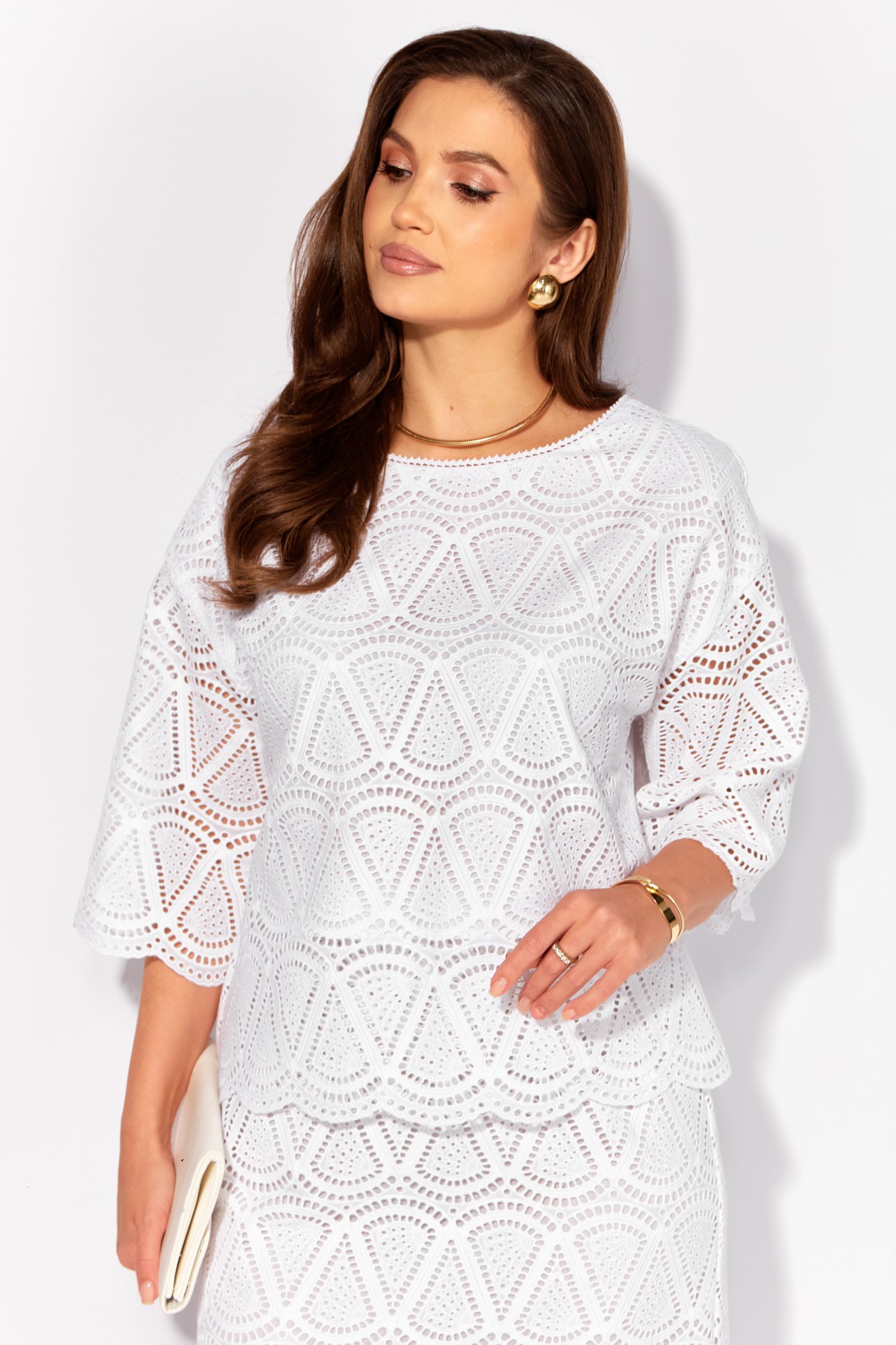 Комплект женский, 2х предметный, состоящий из блузки и юбки. Блузка прямого силуэта с рукавом длинной 3/4. Рукав со спущенной линией плеча. Вырез горловины "лодочка", расширенный, с отделкой кружевной тесьмой. По спинке фигурный вырез акцентирован отделочной "манжетой" Лиф блузки на подкладке. Юбка прямая, с разрезом сбоку. Пояс цельнокроеный с резинкой по кругу. Юбка на подкладке.