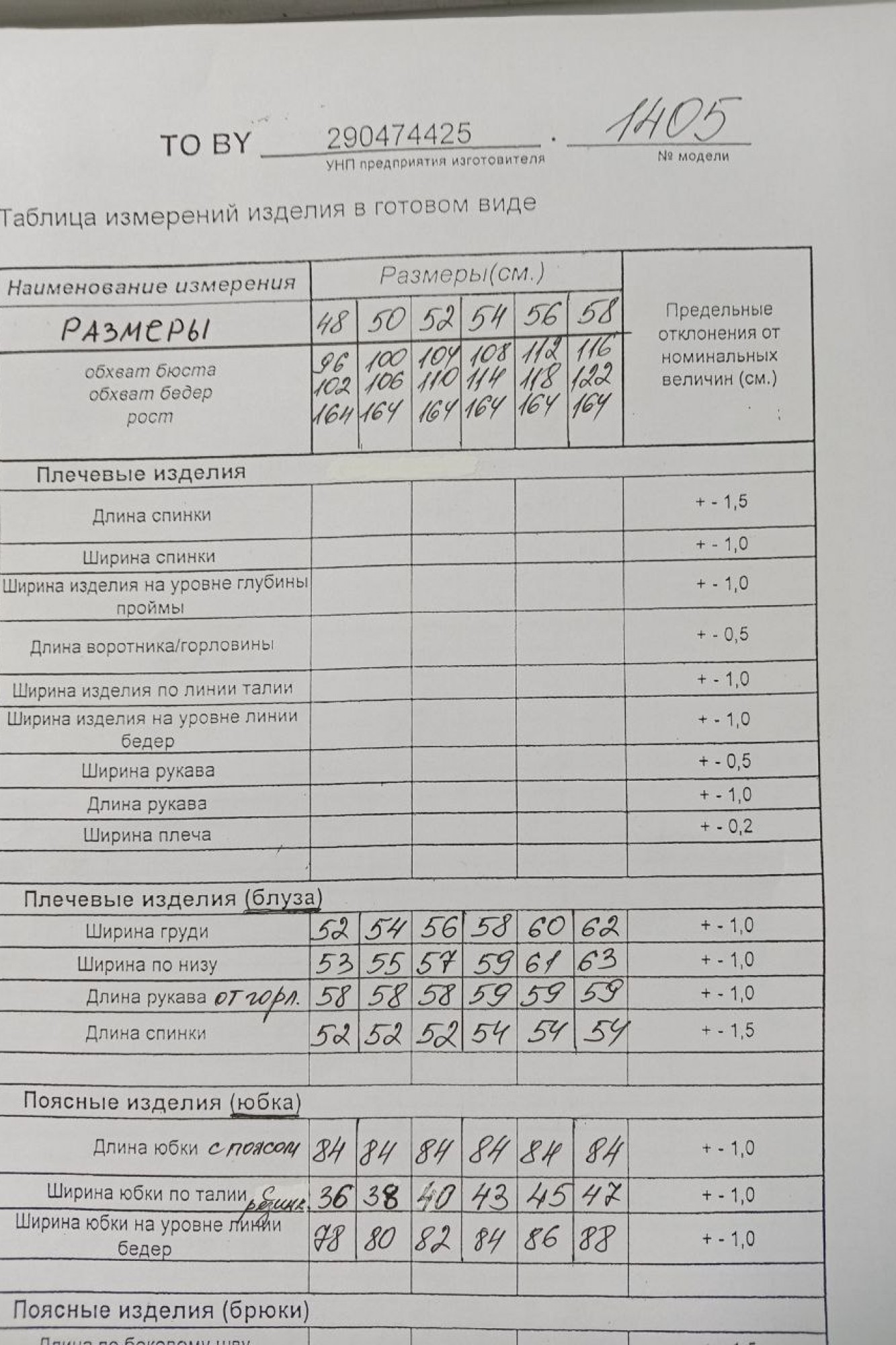Таблица размеров
